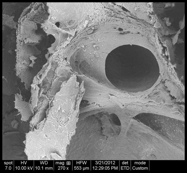 Overview Creator: Andie McCoon Subject: Description:Backscattered Image. Sample from pulp layer. Date Original:2012, March 21 Language:eng Rights Rights Management:Original materials may be protected by the Copyright Law of the United States (more information). Technical Digitization Specifications: Saved as JPEG (level 12) in Photoshop CS5. Date Digital:Sun, 11/11/2012 - 20:00 Format:image/jpeg Type:Image