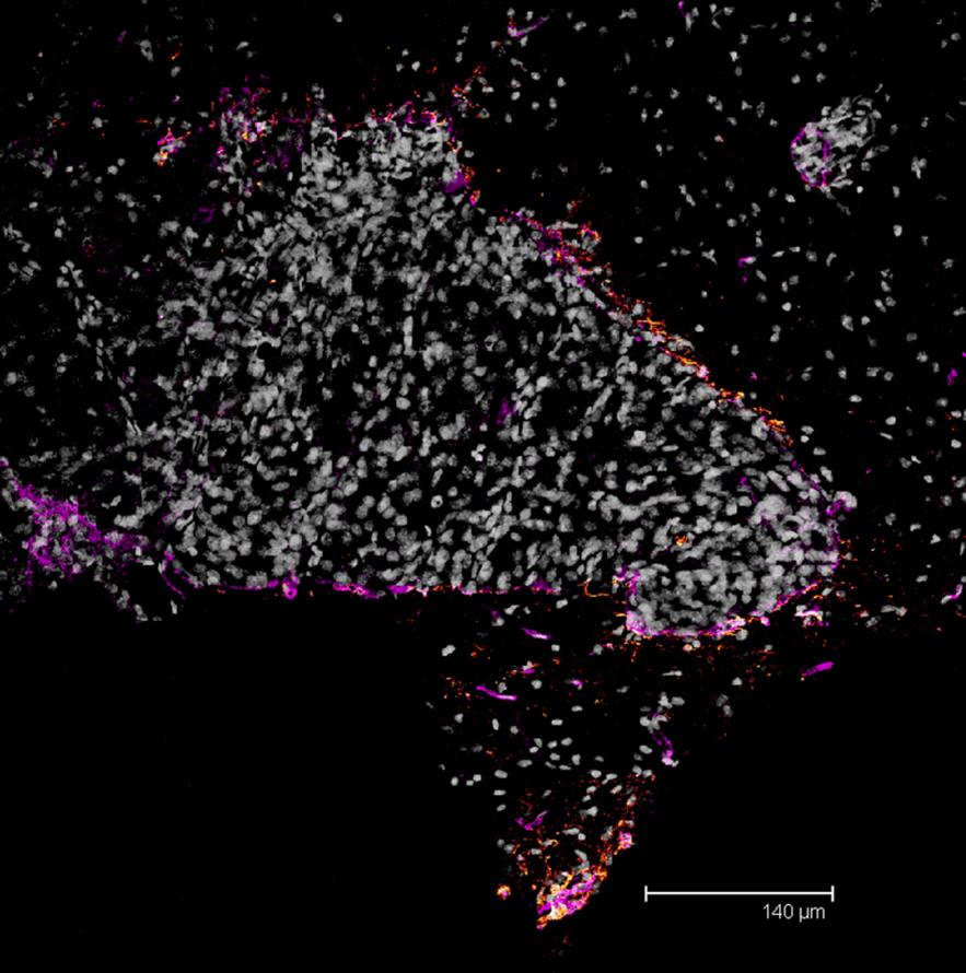 Overview Creator: Monhart, Matt Subject: Description:Transparent projection image of a rat brain section. Nuclei stained with Draq-5 (grey), Glial cells stained with GFAP (glow) and Vasculature with anti-laminin (magenta). Depth of section 7.7 µm. Date Original:2014, December 8 Language:eng Rights Rights Management:Original materials may be protected by the Copyright Law of the United States (more information). Technical Digitization Specifications:Saved as JPEG (level 12) in Photoshop CS6 Date Digital:Tue, 01/27/2015 - 20:00 Format:image/jpeg Type:Image