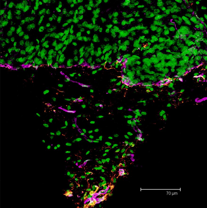Transparent projection image of a rat brain section. Nuclei stained with Draq-5 (green). Glial cells stained with GFAP (glow) and vasculature with anti-laminin (magenta). Depth of section 9.7 µm.