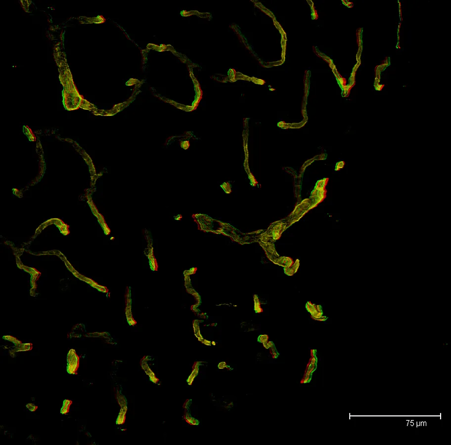 Overview Creator: Reid, Brittany Subject: Description:3D average stereo image of the vasculature of a mouse brain. Depth of section 18.52 μm. Depth factor of 3.0 Date Original:2013, April 26 Language:eng Rights Rights Management:Original materials may be protected by the Copyright Law of the United States (more information). Technical Digitization Specifications:Saved as JPEG (level 12) in Photoshop CS6 Date Digital:Wed, 02/04/2015 - 20:00 Format:image/jpeg Type:Image