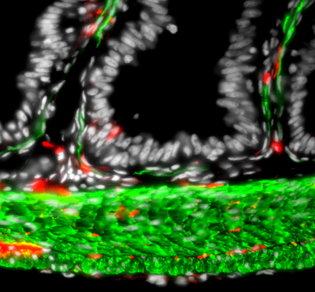 Overview Creator: Schreiber, Alexander Subject: Description:Cross-section of an adult frog intestine stained with fluorescent labels against smooth muscle (green), neurons (red), and cell nuclei (white). Language:eng Rights Rights Management:Original materials may be protected by the Copyright Law of the United States (more information). Technical Digitization Specifications:Images resized to 2000 pixels wide, 72 dpi, and saved as JPEG (level 12) in Photoshop CS5 with Unsharp Mask of 60:1. Date Digital:Thu, 05/17/2012 - 21:00 Format:image/jpeg Type:Image