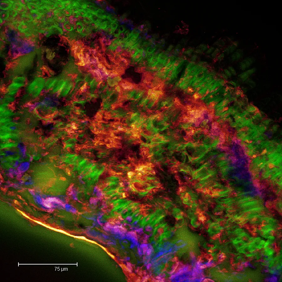 Overview Creator: Tousignant, Joey Subject: Description:Weeping Fig Leaf Cross Section; Ficus benjamina; Average Image of Series Scan; 50.47μm Depth of Section; Epidermal Cells in Green; Phloem-like structure in Glow; Chloroplasts in Blue Date Original:2013, April 9 Language:eng Rights Rights Management:Original materials may be protected by the Copyright Law of the United States (more information). Technical Digitization Specifications:Saved as JPEG (level 12) in Photoshop CS6 Date Digital:Sun, 02/08/2015 - 20:00 Format:image/jpeg Type:Image