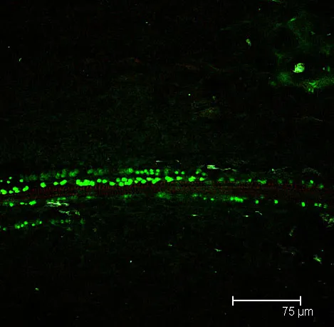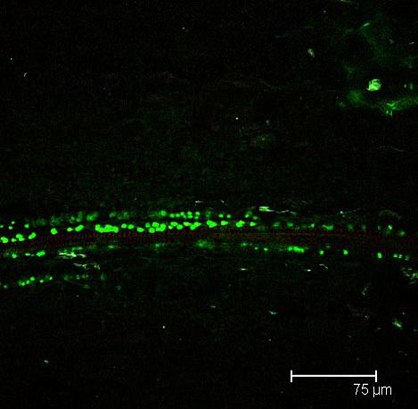 Overview Creator: Jones, Brenton Subject: Description:Single Scan Image of a White Daisy Petal (Leucanthemum vulgare) Phloem shown in Red, cell walls shown in green Date Original:2012, April 8 Language:eng Rights Rights Management:Original materials may be protected by the Copyright Law of the United States (more information). Technical Digitization Specifications:Saved as JPEG (level 12) in Photoshop CS6 Date Digital:Tue, 02/03/2015 - 20:00 Format:image/jpeg Type:Image