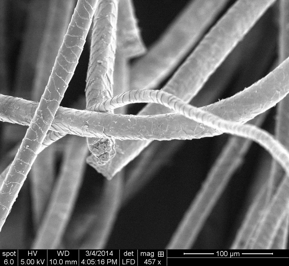 Winter Hat Fiber, Low Vacuum, SE Image, WD: 10.0mm, HV: 5.00 kV, Spot size: 6.0, Magnification: 457x, Pressure: 0.23 Torr