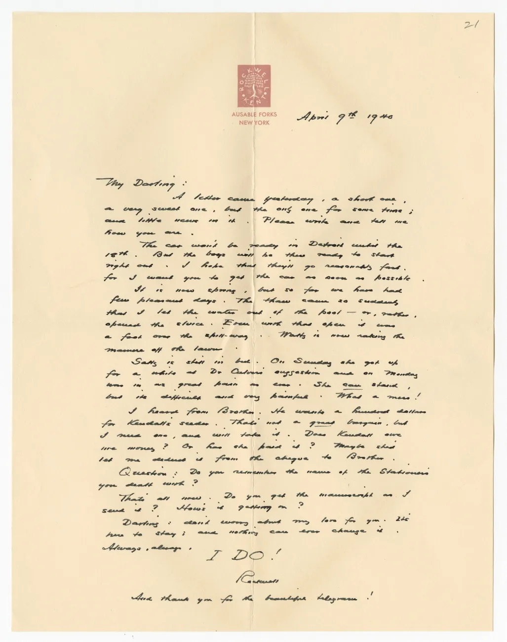Overview Creator: Kent, Rockwell, 1882-1971 Subject: Source:Original letter: ink on paper, 1 p. Date Original:1940, April 9 Language:eng Rights Rights Management:Original materials may be protected by the Copyright Law of the United States (more information). Technical Digitization Specifications:Scanned at 600ppi on Epson 1000XL scanner as 48-bit RGB uncompressed TIFF images. Images resized to 2000 pixels wide, 150 dpi, and saved as JPEG (level 10) in Photoshop CS5 with Unsharp Mask of 60:1. Date Digital:Mon, 10/01/2012 - 21:00 Format:image/jpeg Type:Still Image Location Series:1 Box:1 Folder:22