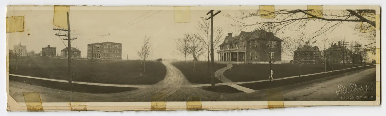 A view of most of the campus buildings taken from Park Street looking northeast. Left to right: Fisher Hall, Richardson Hall, the Gymnasium, Carnegie Hall, Beta House, Memorial Hall (Home of the weather bureau at the time), and Cook Hall of the SLU Agricultural School.