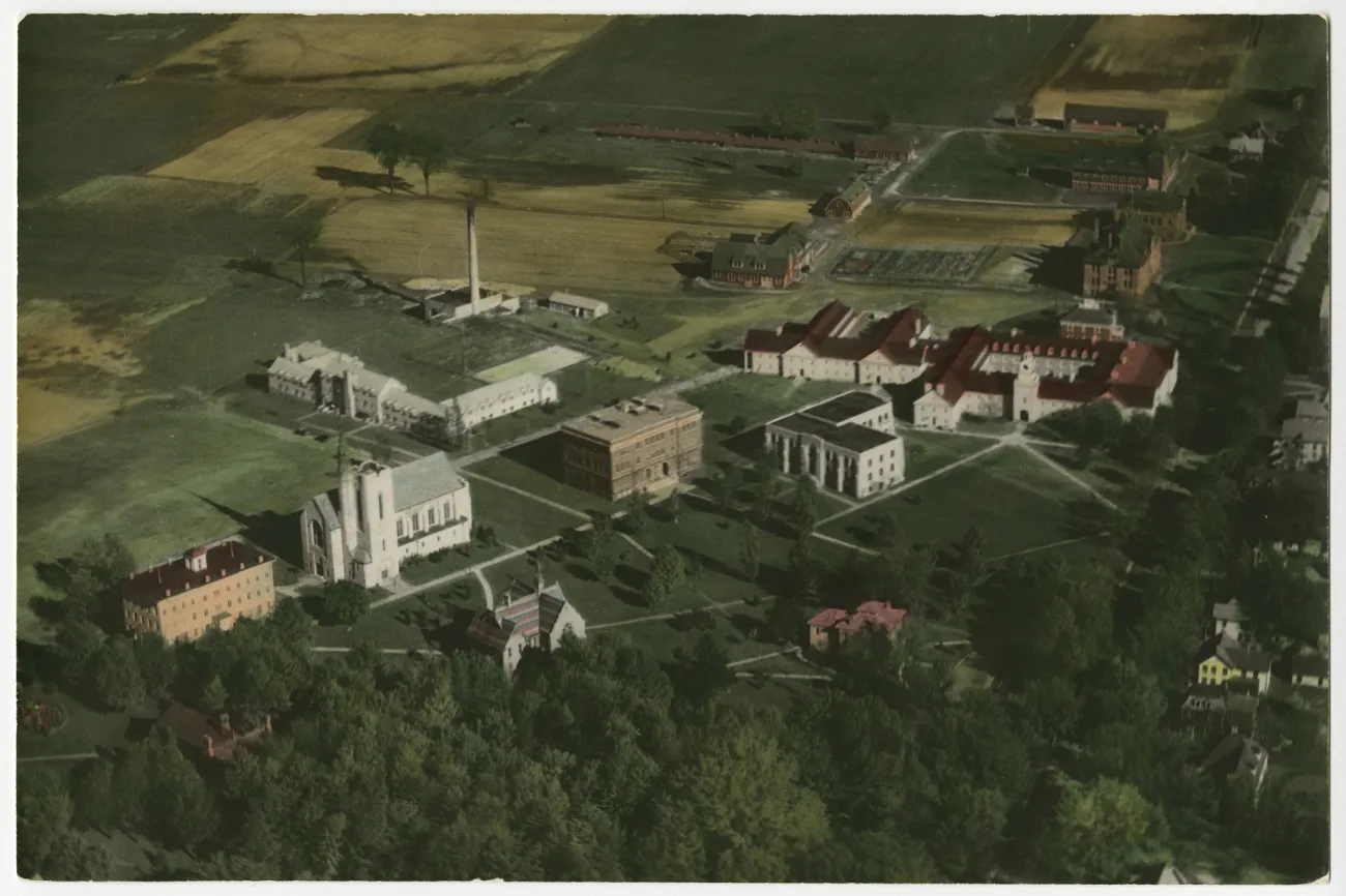 The first aerial photo taken of the SLU campus, along with that of the Agricultural and Technical Institute, looking southeast. In the lower portion of the photo are Herring-Cole Library, Richardson Hall, Gunnison Chapel, Fisher Hall and Park Street Hall. Toward the center, Dean Eaton Residence for women (1928), Carnegie Hall, Hepburn Hall and Men's Residence (1931, later Sykes). The upper part of the photo consists of the ATI campus, Memorial Hall, Cook (Piskor) Hall, Payson Hall and various barns and outbuildings associated with ATI.