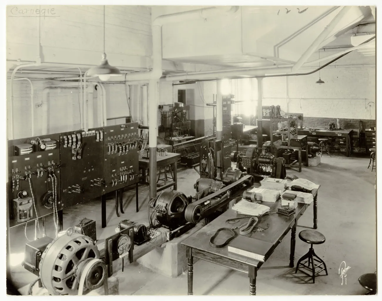 An electric lab in the basement of Carnegie Hall, part of the physics department, probably from the 1910s or 20s.