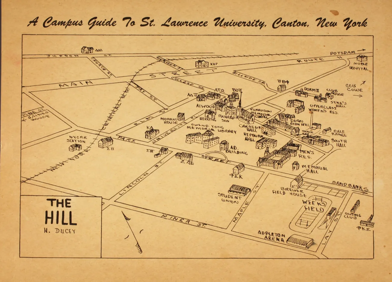 Explore this collection building Overview Creator: Ducey, Herbert Subject: St. Lawrence University -- HistorySt. Lawrence University -- Maps Description:A hand-drawn campus guide to St. Lawrence University drawn by Herbert Ducey, class of 1959 showing the campus of the late 1950s Coverage:Canton, NY Source:map, ink on paper, 7" h x 9 5/8" w Date Original:1958 Decade:Sat, 12/31/1949 - 20:00 Rights Rights Management:Original materials may be protected by the Copyright Law of the United States (more information). Resource Identifier:ODY Special Collections, Mss 70, St. Lawrence University Maps Publisher:St. Lawrence University Contributor:Herbert Ducey Technical Digitization Specifications:Scanned at 600ppi on Epson 1000XL scanner as 48-bit RGB uncompressed TIFF images. Images resized to 960 pixels wide, 150 dpi, and saved as JPEG (level 10) in Photoshop CS5 with Unsharp Mask of 60:1. Date Digital:Thu, 01/19/2012 - 20:00 Format:image/jpeg Type:Still Image Contributing Institution:St. Lawrence University