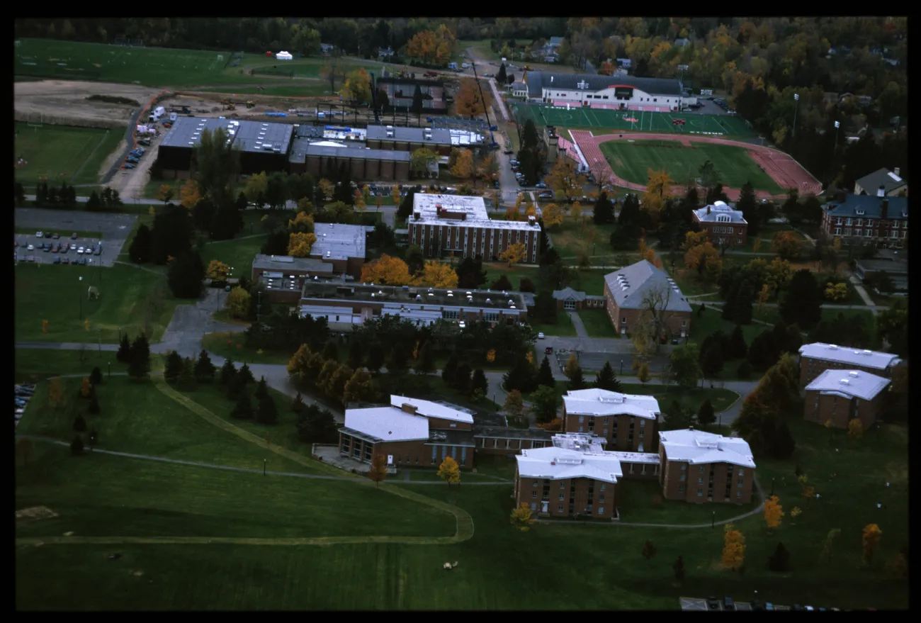 The lower portion of campus at the start of the last building boom of the 2000s. Notice the new track and field complex, North Country Field and the early construction of Newell Field House. Johnson Hall of Science would eventually be built in the center right portion of this picture.