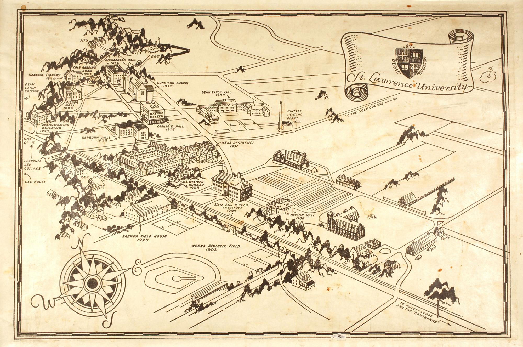 Explore this collection building Overview Creator: unknown Subject: St. Lawrence University -- HistorySt. Lawrence University -- Maps Description:This "place mat"-sized map shows a panorama of all campus buildings in the mid-1930s time frame, including the buildings and barns belonging to the New York State Agricultural and Technical Institute. Coverage:Canton, NY Source:Map, ink on paper, 13" h x 19" w Date Original:[193?] Decade:Tue, 12/31/1929 - 20:00 Rights Rights Management:Original materials may be protected by the Copyright Law of the United States (more information). Resource Identifier:ODY Special Collections, Mss 70, St. Lawrence University Maps Publisher:St. Lawrence University Contributor:St. Lawrence University Technical Digitization Specifications:Scanned at 600ppi on Epson 1000XL scanner as 48-bit RGB uncompressed TIFF images. Images resized to 2000 pixels wide, 150 dpi, and saved as JPEG (level 10) in Photoshop CS5 with Unsharp Mask of 60:1. Date Digital:Thu, 01/19/2012 - 20:00 Format:image/jpeg Type:Still Image Contributing Institution:St. Lawrence University