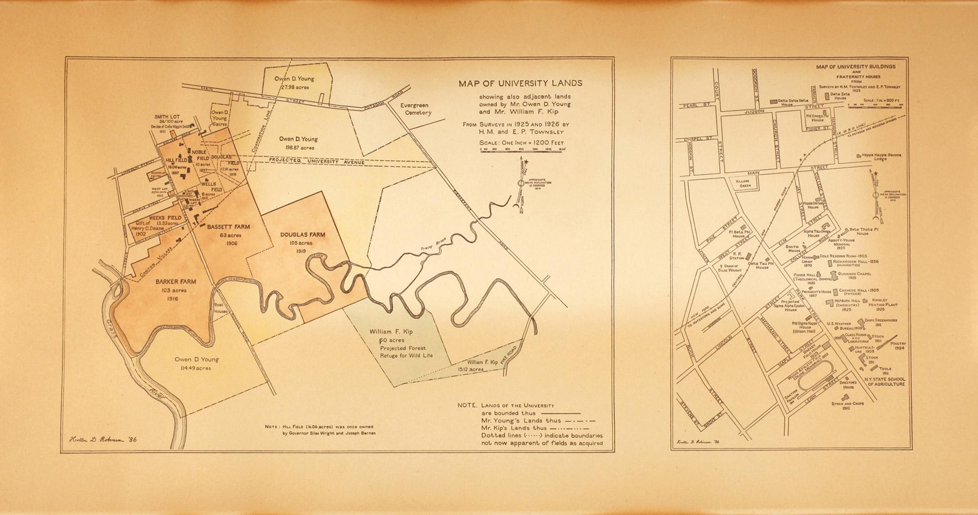 These two maps show the development of St. Lawrence University in the mid-1920s. Both maps were included in the first comprehensive alumni directory, called the General Catalogue, which was published in 1926. The map was drawn by the famous engineer, suspension bridge builder and 1886 alum, Holton D. Robinson.