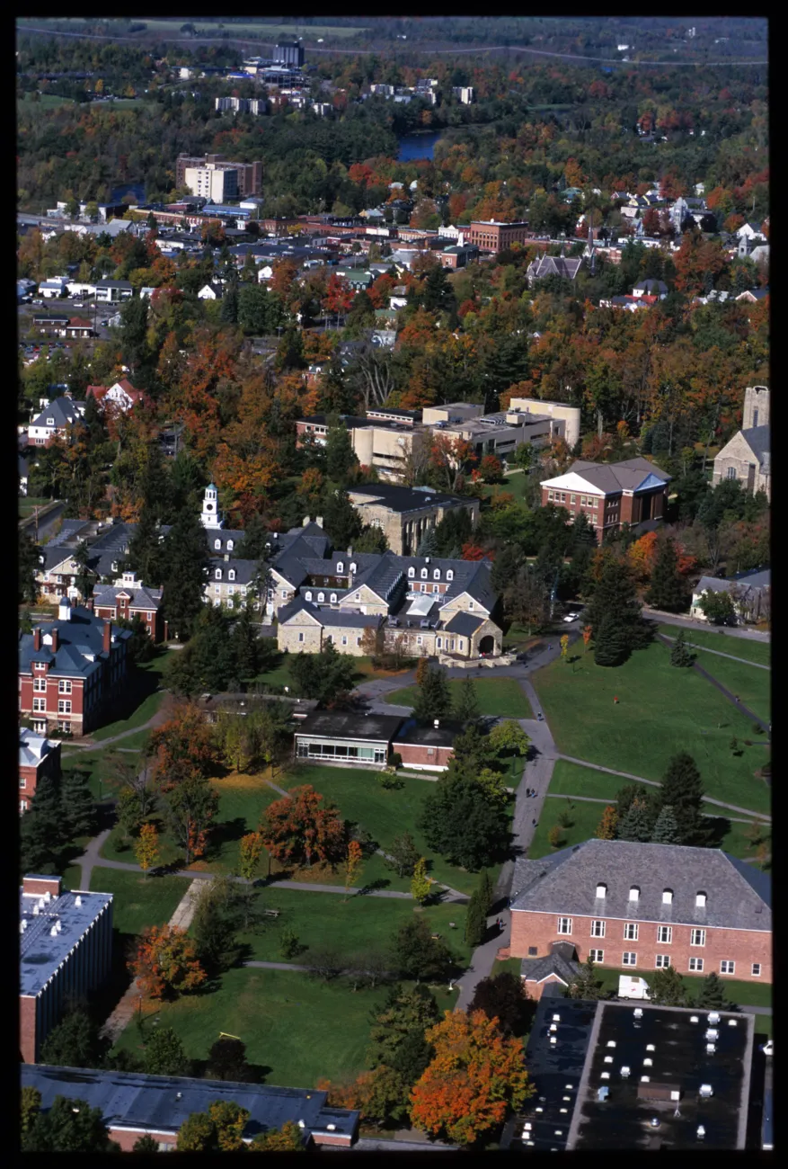 An aerial view showing the areas of campus that would, a few years later, become the home of the Johnson Hall of Science and the Sulllivan Student Center. Buildings in the lower part of the picture (l to r) are Bewkes, Valentine and Brown Halls. Also pictured are Piskor Hall, the old bookstore and health center, Madill Hall, Dana Dining Hall and Sykes Residence, Hepburn Hall, ODY Library, Carnegie Hall and Gunnison Chapel.