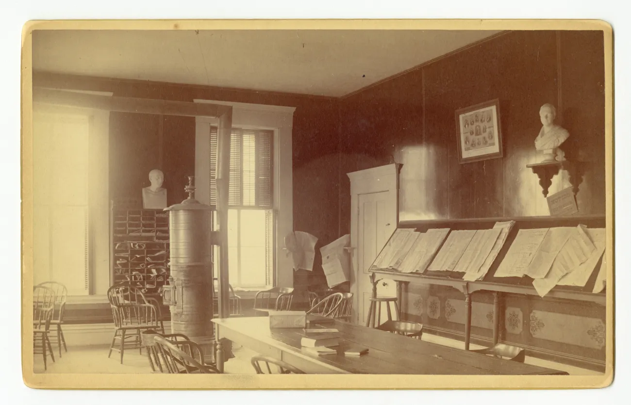 A reading and study room in what was then known as College Hall, prior to the 1906 renovations. With little money for books or other materials and a poorly heated Herring Library, students at St. Lawrence University took it upon themselves to supply this room with a few newspapers and magazines through a student club, with heat provided by a pot-bellied stove.