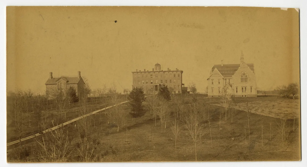 Explore this collection building Overview Creator: unknown Subject: St. Lawrence University -- HistorySt. Lawrence University -- BuildingsSt. Lawrence University -- PhotographsSt. Lawrence University -- Panoramic Photographs Description:The campus in the late 1800s looking east from Park Street. L to R: Herring Library, Richardson (College) Hall, Fisher Hall. Many of the trees in the foreground would have been planted by students during the Spring "Tree Holiday". Coverage:Canton, NY Source:Photograph, sepia tone, 7 3/4"w x 4"h Date Original:[188?] Decade:Wed, 12/31/1879 - 19:45 Rights Rights Management:Original materials may be protected by the Copyright Law of the United States (more information). Resource Identifier:ODY Special Collections, Archives, RG2, Series 3.2 B&G Campus Box 8 Publisher:St. Lawrence University Contributor:unknown Technical Digitization Specifications:Scanned at 600ppi on Epson 1000XL scanner as 48-bit RGB uncompressed TIFF images. Images resized to 2000 pixels wide, 150 dpi, and saved as JPEG (level 10) in Photoshop CS5 with Unsharp Mask of 60:1. Date Digital:Wed, 12/21/2011 - 20:00 Format:image/jpeg Type:Still Image Contributing Institution:St. Lawrence University Location Series:3 Box:8 Folder:1870-1890