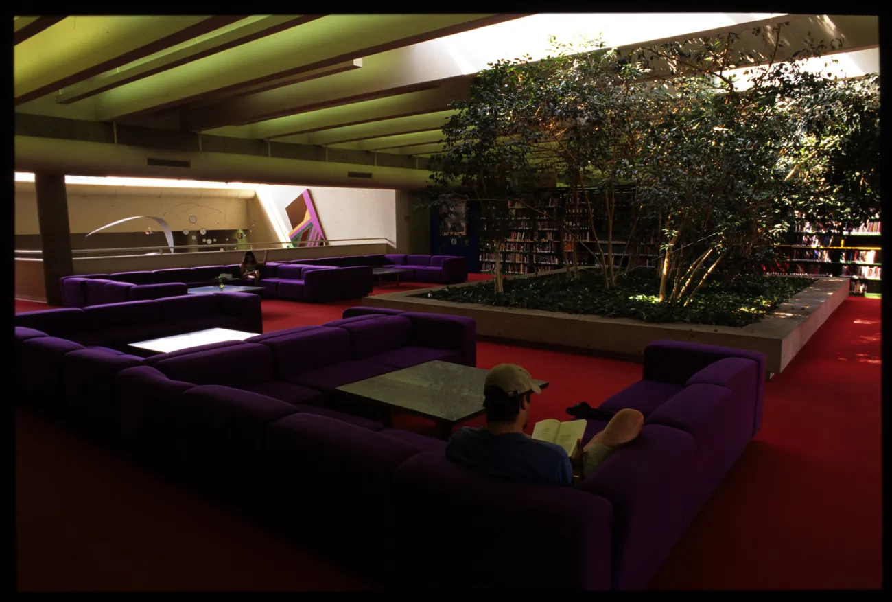 Explore this collection building Overview Creator: unknown Subject: St. Lawrence University -- HistorySt. Lawrence University -- BuildingsOwen D. Young Library (Canton, NY) Description:The upper level reading room also featured an interesting original color scheme...as well as living trees dominating the common area. Coverage:Canton, NY Source:Photographic slide, color Date Original:[198?] Decade:Mon, 12/31/1979 - 20:00 Rights Rights Management:Original materials may be protected by the Copyright Law of the United States (more information). Resource Identifier:ODY Special Collections, Archives, RG2, Series 3.2 B&G Campus Box 23 Publisher:St. Lawrence University Contributor:unknown Technical Digitization Specifications:Scanned with Nikon Super CoolScan 9000 ED scanner as uncompressed TIFF images resized to 2000 pixels wide, 150 dpi, and saved as JPEG (level 10) in Photoshop CS5 with unsharp mask of 60:1. Date Digital:Mon, 02/06/2012 - 20:00 Format:image/jpeg Type:Still Image Contributing Institution:St. Lawrence University Location Owen D. Young Library Series:3 Box:23