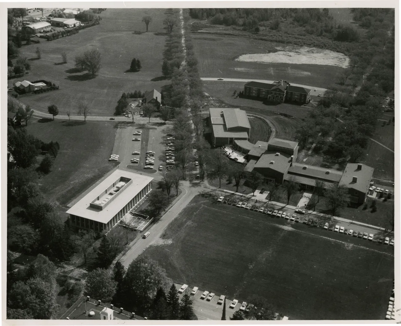 Explore this collection building Overview Creator: Church, Dwight P. Subject: St. Lawrence University -- HistorySt. Lawrence University -- BuildingsSt. Lawrence University -- PhotographsSt. Lawrence University -- Aerial Photographs Description:A late 60s-early 70s view looking east straight down Romoda Drive. Clockwise from left: Vilas Hall, Greek house, Hulett Hall, Griffiths Art Center, Noble University Center. Coverage:Canton, NY Source:Photograph, b & w, 8" h x 10" w Date Original:[197?] Decade:Wed, 12/31/1969 - 20:00 Rights Rights Management:Original materials may be protected by the Copyright Law of the United States (more information). Resource Identifier:ODY Special Collections, Archives, RG2, Series 3.2 B&G Campus Box 9 Publisher:St. Lawrence University Contributor:Dwight P. Church Technical Digitization Specifications:Scanned at 600ppi on Epson 1000XL scanner as 48-bit RGB uncompressed TIFF images. Images resized to 2000 pixels wide, 150 dpi, and saved as JPEG (level 10) in Photoshop CS5 with Unsharp Mask of 60:1. Date Digital:Sun, 01/15/2012 - 20:00 Format:image/jpeg Type:Still Image Contributing Institution:St. Lawrence University Location Series:3 Box:9 Folder:1970s