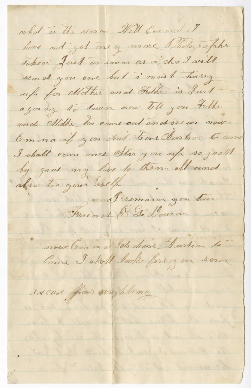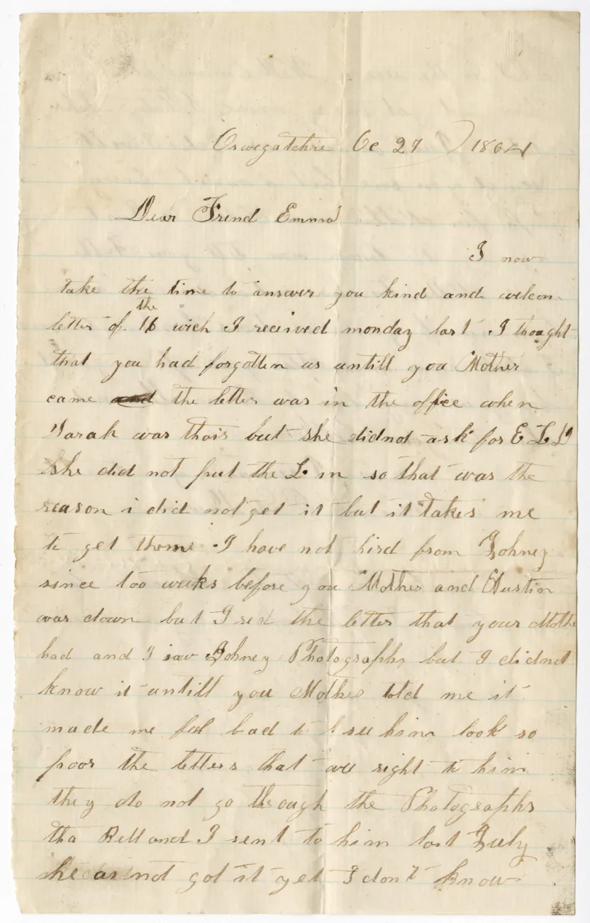 Overview Creator: E. L. Dawson Subject: E. L. DawsonSunderland, John Coverage:Oswegotchie, NY Source:Original letter: ink on paper, 2 p. Language:eng Rights Rights Management:Original materials may be protected by the Copyright Law of the United States (more information). Date Original (Precise) Wed, 10/26/1864 - 19:45 Technical Digitization Specifications:Scanned at 600ppi on Epson 1000XL scanner as 48-bit RGB uncompressed TIFF images. Images resized to 960 pixels wide, 150 dpi, and saved as JPEG (level 10) in Photoshop CS5 with Unsharp Mask of 60:1. Date Digital:Mon, 10/03/2011 - 21:00 Format:image/jpeg Type:Text Location Series:3 Box:2 Folder:67 Excerpt I have not hird [heard] from Johny since two weeks before you[r] Mother and Austin was down but I sent the letter that your mother had
