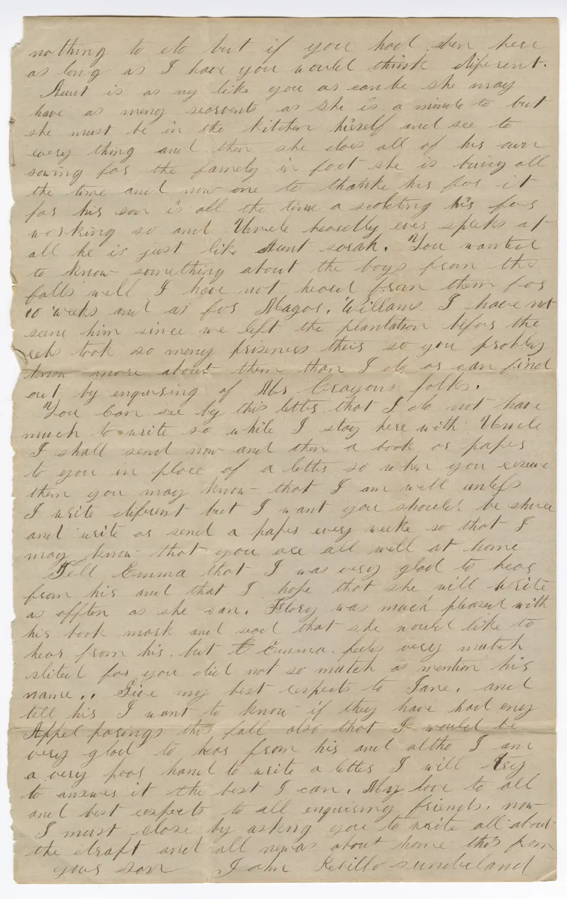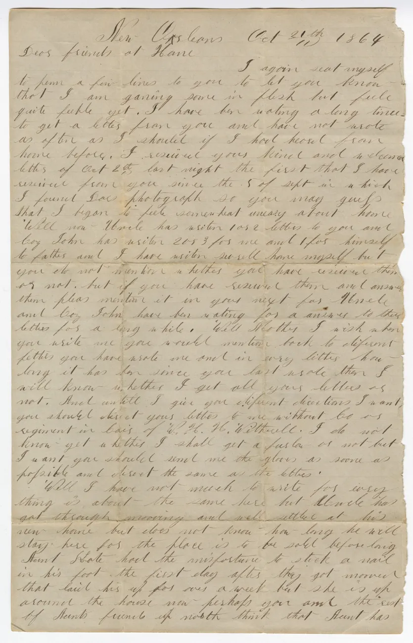 Overview Creator: Sunderland, John Subject: Sunderland, John Coverage:New Orleans, LA Source:Original letter: ink on paper, 2 p. Language:eng Rights Rights Management:Original materials may be protected by the Copyright Law of the United States (more information). Date Original (Precise) Thu, 10/20/1864 - 19:45 Technical Digitization Specifications:Scanned at 600ppi on Epson 1000XL scanner as 48-bit RGB uncompressed TIFF images. Images resized to 960 pixels wide, 150 dpi, and saved as JPEG (level 10) in Photoshop CS5 with Unsharp Mask of 60:1. Date Digital:Sun, 10/02/2011 - 21:00 Format:image/jpeg Type:Text Location Series:2 Box:2 Folder:56 Excerpt Dear friends at Home I again seat myself to pen a few lines to you to let you know that I am ganing [gaining] some in flesh but feele quite feeble yet.