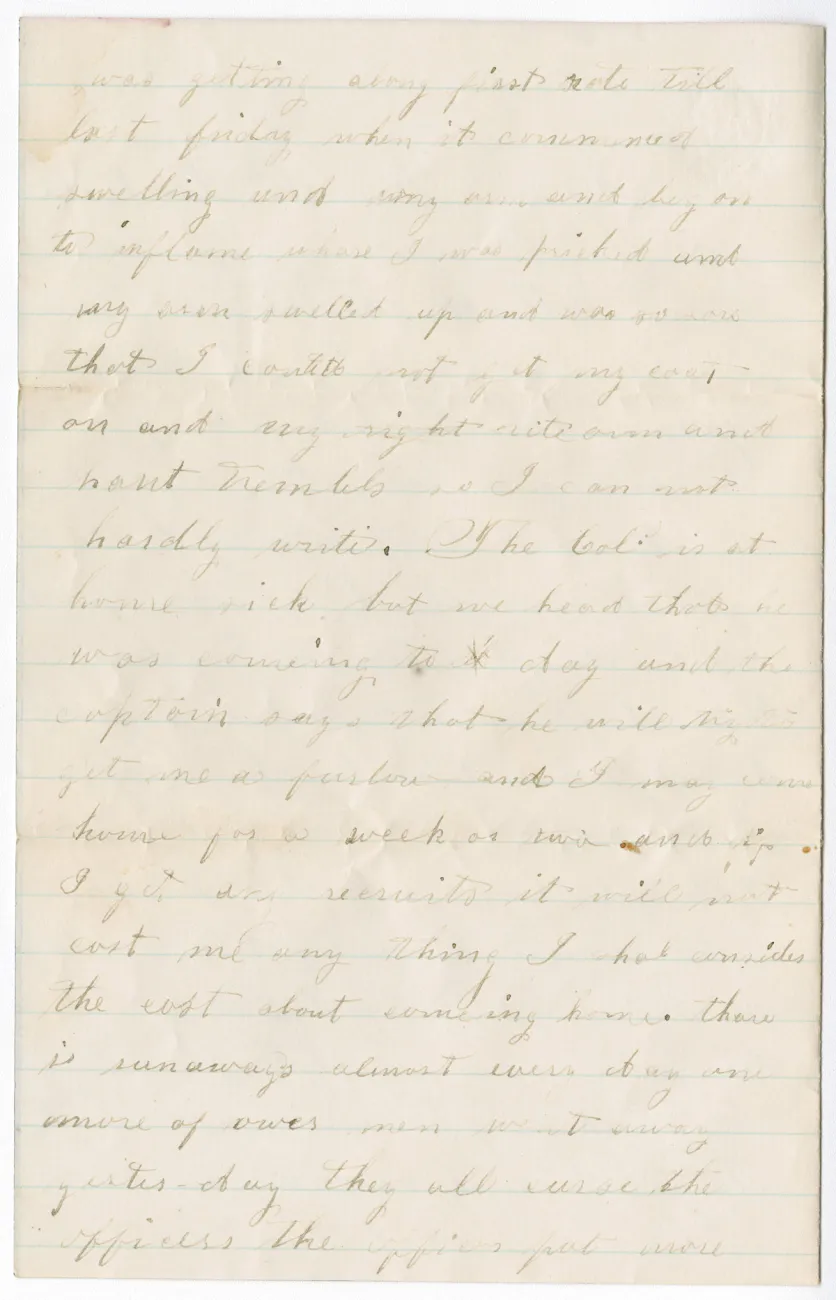 Overview Creator: Sunderland, Darwin Subject: Sunderland, Darwin Coverage:Albany, NY Source:Original letter: ink on paper, 4 p. Language:eng Rights Rights Management:Original materials may be protected by the Copyright Law of the United States (more information). Date Original (Precise) Wed, 01/08/1862 - 19:45 Technical Digitization Specifications:Scanned at 600ppi on Epson 1000XL scanner as 48-bit RGB uncompressed TIFF images. Images resized to 960 pixels wide, 150 dpi, and saved as JPEG (level 10) in Photoshop CS5 with Unsharp Mask of 60:1. Date Digital:Sun, 09/25/2011 - 21:00 Format:image/jpeg Type:Text Location Series:1 Box:1 Folder:04 Excerpt Father & Mother I received yours of the 5 and was glad to hear from home. I sent a letter by Howard Cast Saturday to the post to be left at _________. He said he should get there at night.