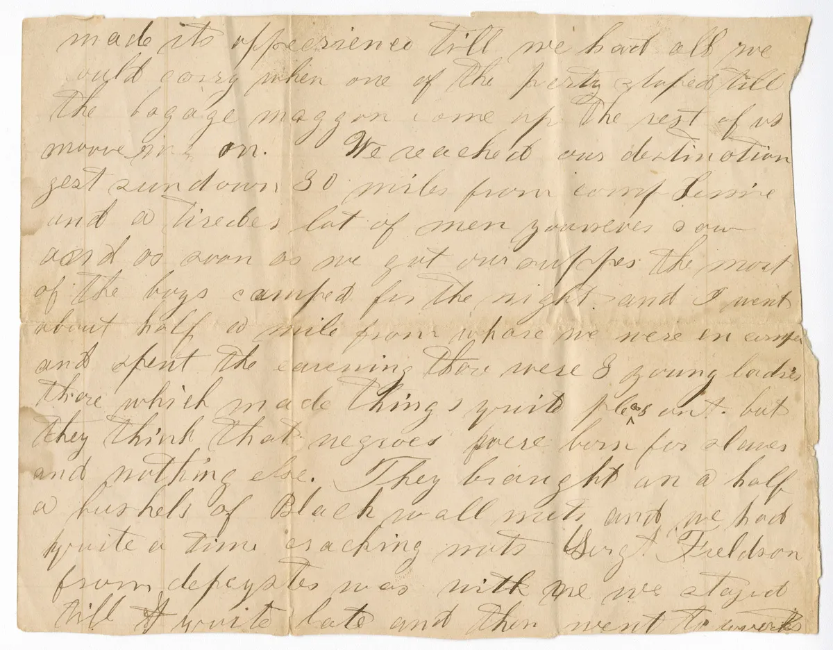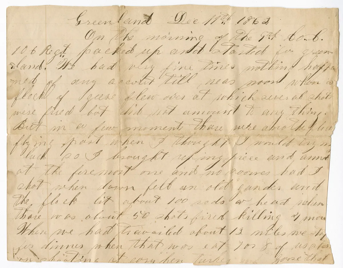 On the morning of the 9th Co. C 106 Regt. Packed up and started for Greenland. We had very fine times. Nothing happened of any account till near noon when a flock of geese flew over at which several shots were fired but did not amount to anything.