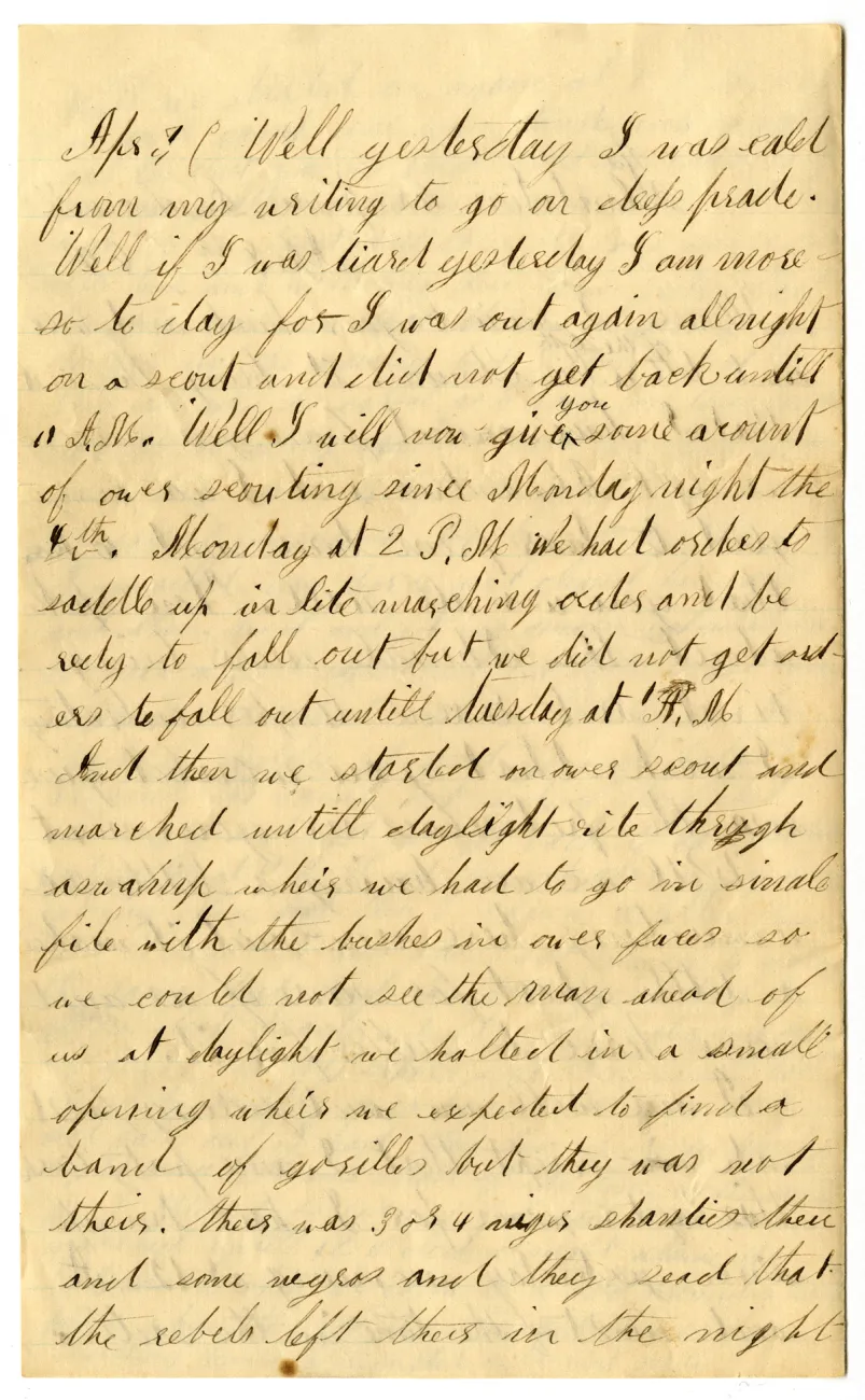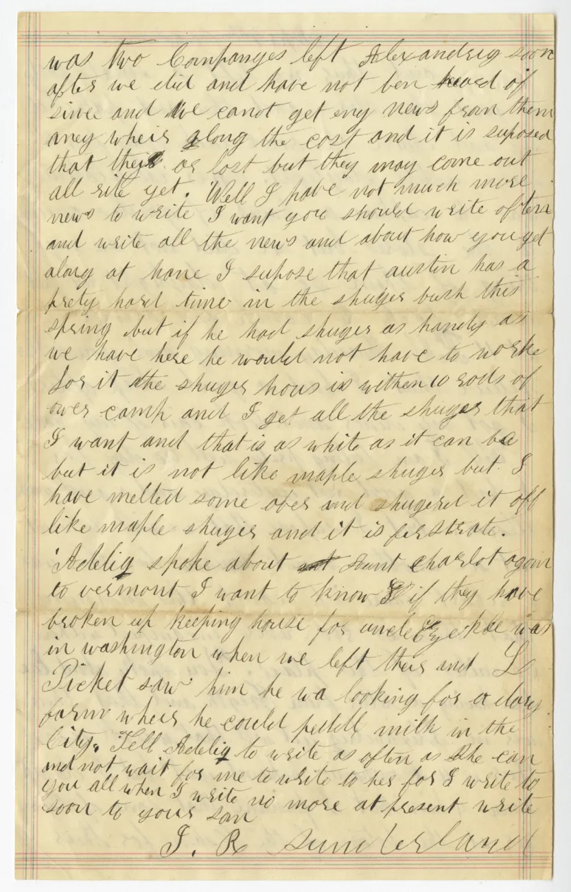 Overview Creator: Sunderland, John Subject: Sunderland, JohnSugar growing--Louisiana--History--19th Century Coverage:Donaldsonville, Louisiana Source:Original letter: ink on paper, 6 p. Language:eng Rights Rights Management:Original materials may be protected by the Copyright Law of the United States (more information). Date Original (Precise) Tue, 04/05/1864 - 19:45 Technical Digitization Specifications:Scanned at 600ppi on Epson 1000XL scanner as 48-bit RGB uncompressed TIFF images. Images resized to 960 pixels wide, 150 dpi, and saved as JPEG (level 10) in Photoshop CS5 with Unsharp Mask of 60:1. Date Digital:Sun, 10/02/2011 - 21:00 Format:image/jpeg Type:Text Location Series:2 Box:2 Folder:44 Excerpt Have I received your kind and welcomed letter of the 20th this afternoon. it being the first that I have received from you since we left Alexandria and I was very glad to hear from home and to hear that you was all well.