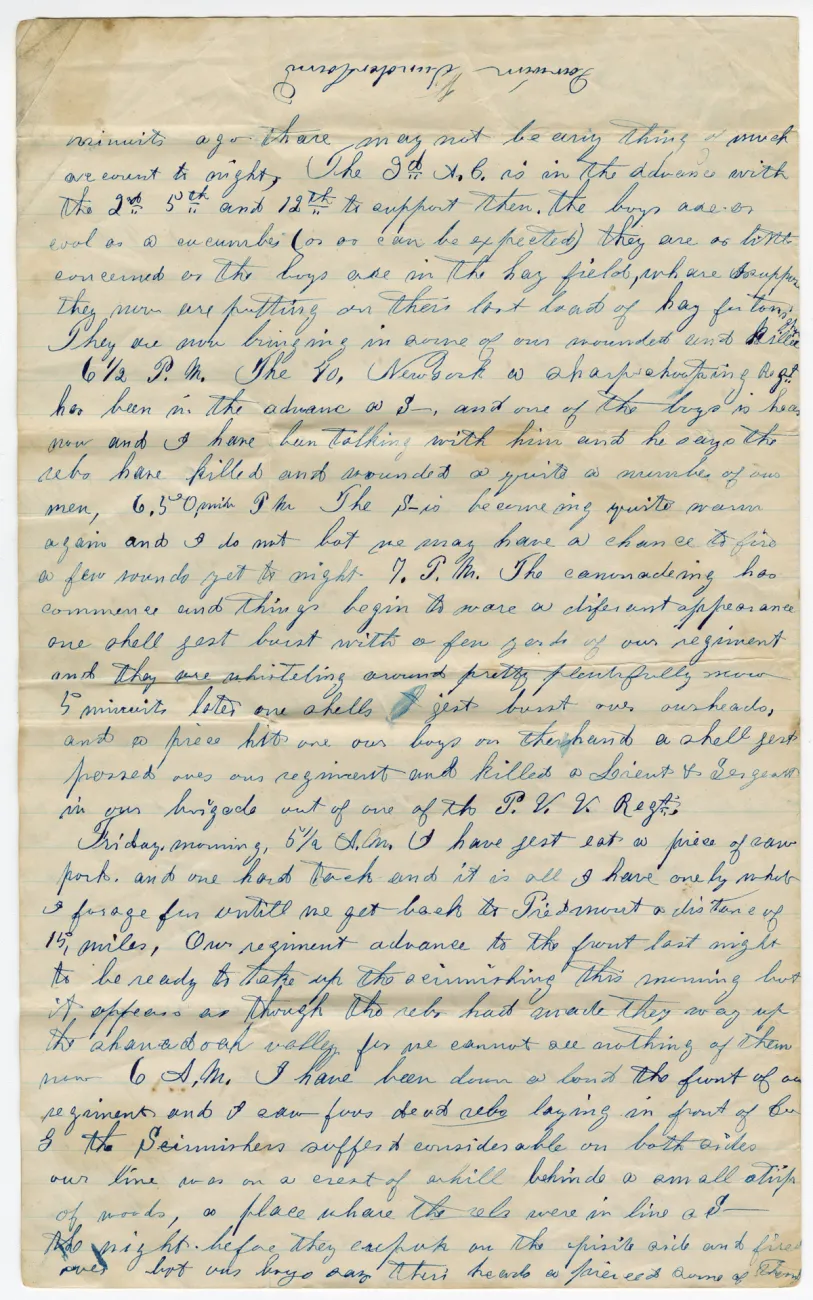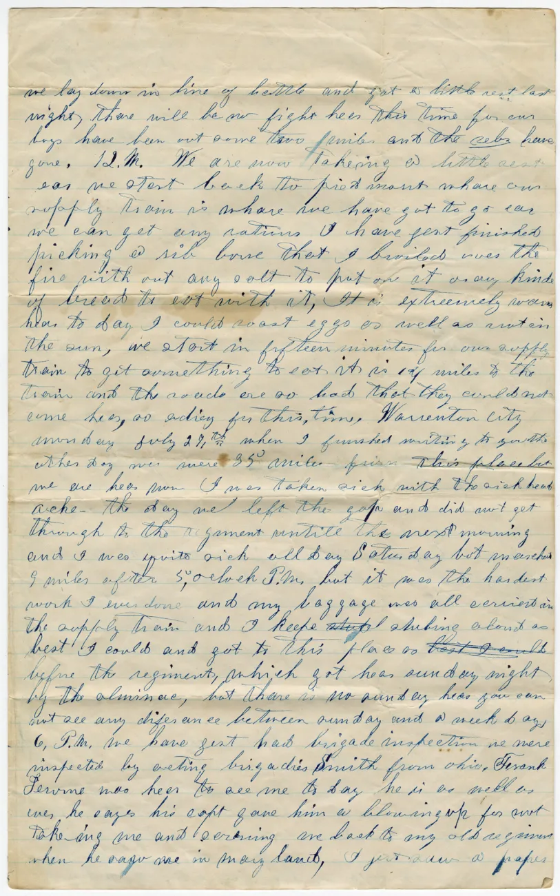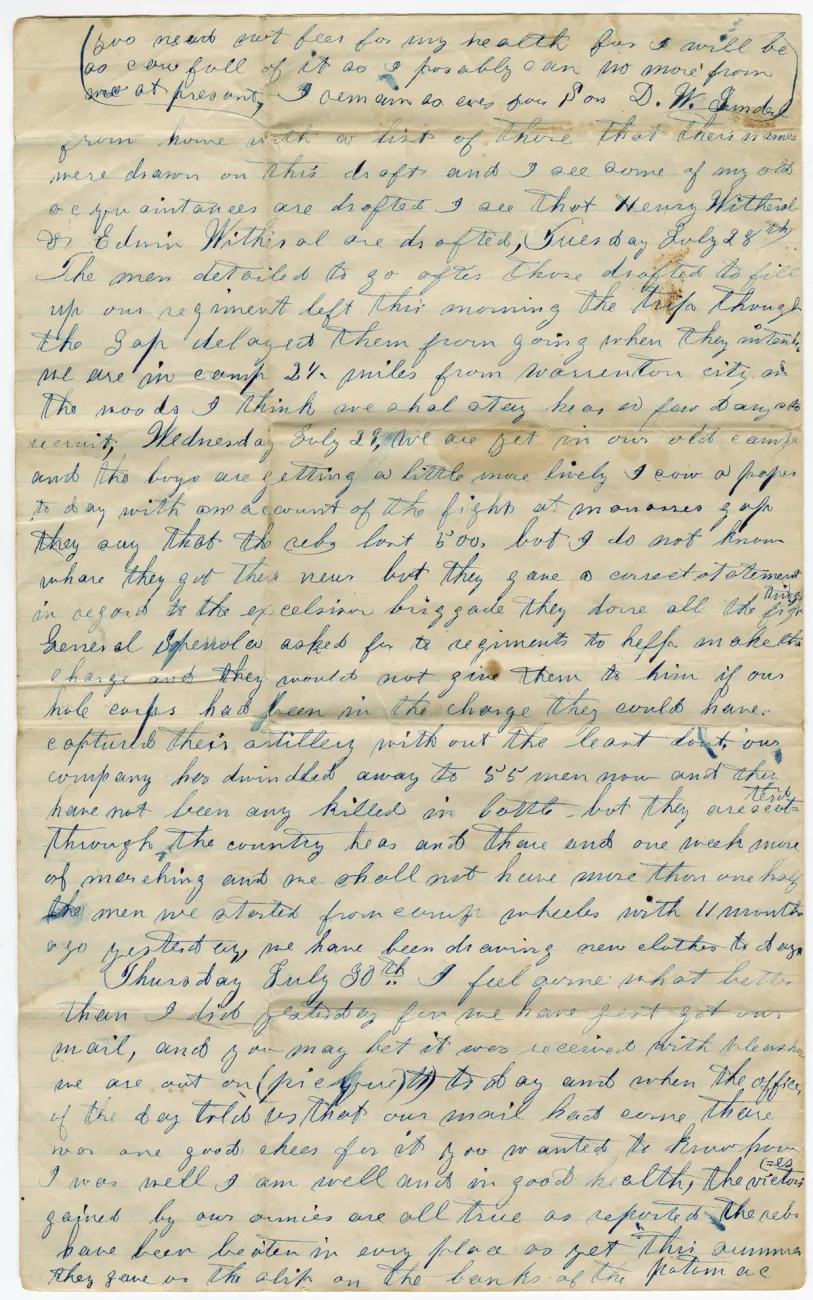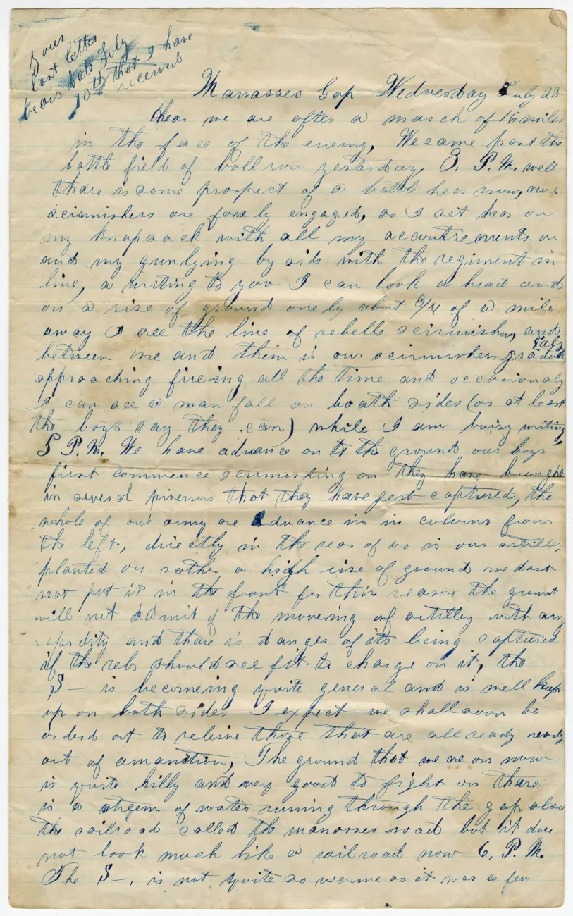 Overview Creator: Sunderland, Darwin Subject: Sunderland, Darwin Coverage:Manassas Gap, VA Source:Original letter: ink on paper, 4 p. Language:eng Rights Rights Management:Original materials may be protected by the Copyright Law of the United States (more information). Date Original (Precise) Wed, 07/22/1863 - 19:45 Technical Digitization Specifications:Scanned at 600ppi on Epson 1000XL scanner as 48-bit RGB uncompressed TIFF images. Images resized to 960 pixels wide, 150 dpi, and saved as JPEG (level 10) in Photoshop CS5 with Unsharp Mask of 60:1. Date Digital:Tue, 09/27/2011 - 21:00 Format:image/jpeg Type:Text Location Series:1 Box:1 Folder:29 Excerpt Hear we are after a march of 16 miles in the face of the enemy. We came past the battle field of bull run yesterday.