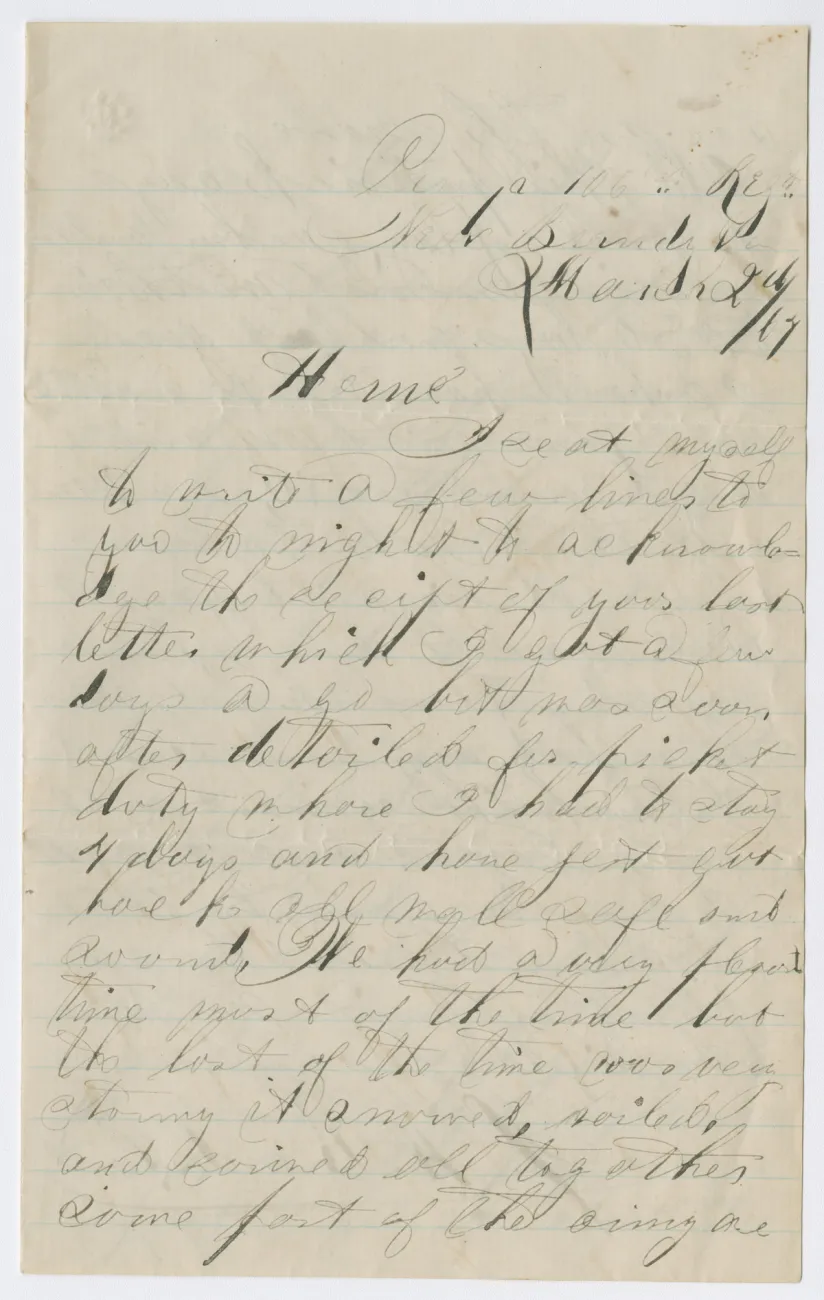 I seat myself to write a few lines to you to night to acknowledge the recipt of your last letter which I got a few days ago but was soon after detailed for picket duty where I had to stay 4 days and have jest got back all well safe and sound.