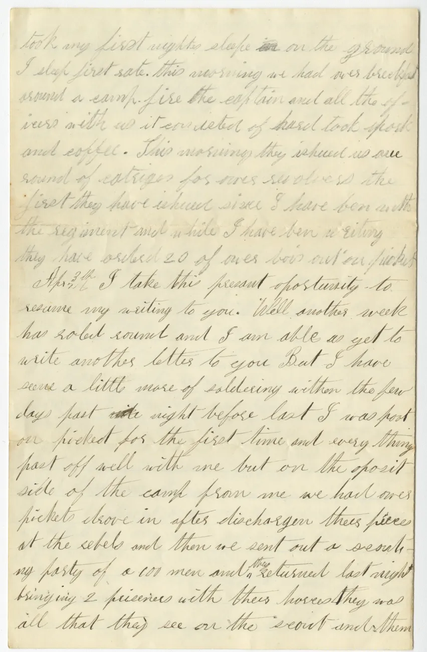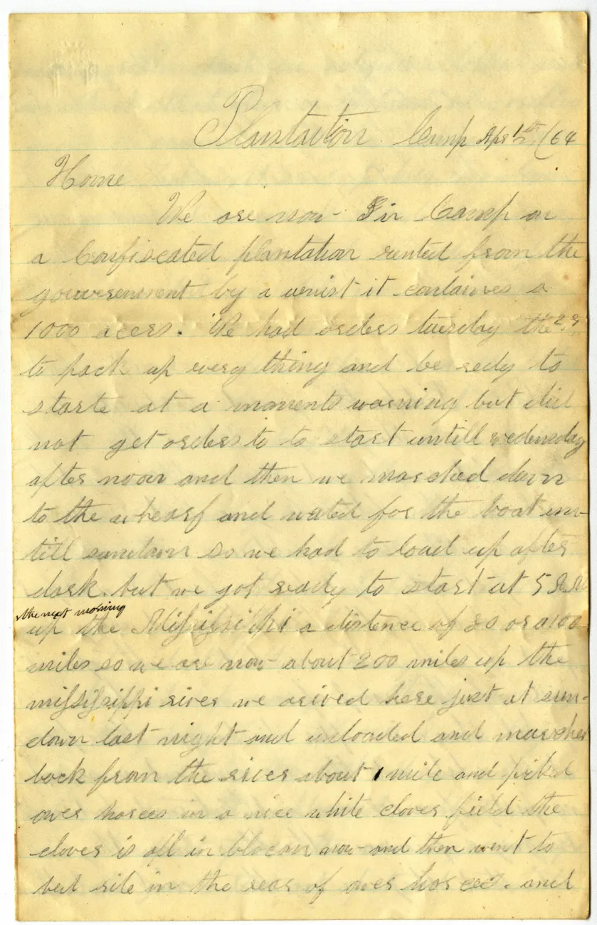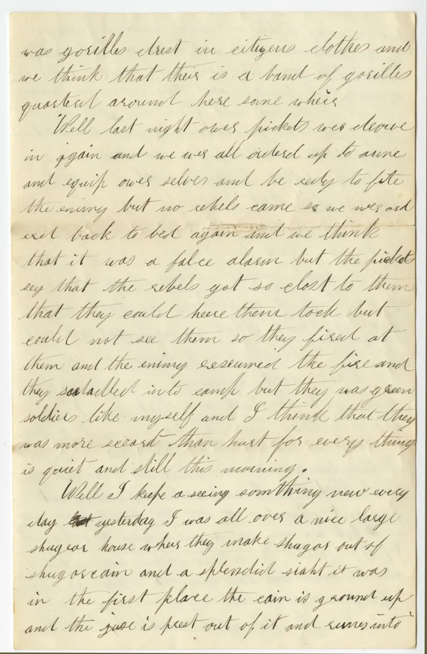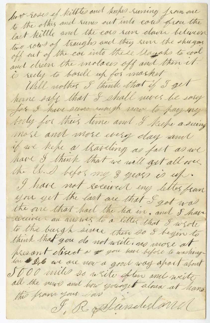 Overview Creator: Sunderland, John Subject: Sunderland, JohnSugar growing--Louisiana--History--19th Century Coverage:Mississippi River Source:Original letter: ink on paper, 4 p. Language:eng Rights Rights Management:Original materials may be protected by the Copyright Law of the United States (more information). Date Original (Precise) Thu, 03/31/1864 - 19:45 Technical Digitization Specifications:Scanned at 600ppi on Epson 1000XL scanner as 48-bit RGB uncompressed TIFF images. Images resized to 960 pixels wide, 150 dpi, and saved as JPEG (level 10) in Photoshop CS5 with Unsharp Mask of 60:1. Date Digital:Sun, 10/02/2011 - 21:00 Format:image/jpeg Type:Text Location Series:2 Box:2 Folder:43 Excerpt Home We are now in Camp on a confiscated plantation rented from the gouverenment