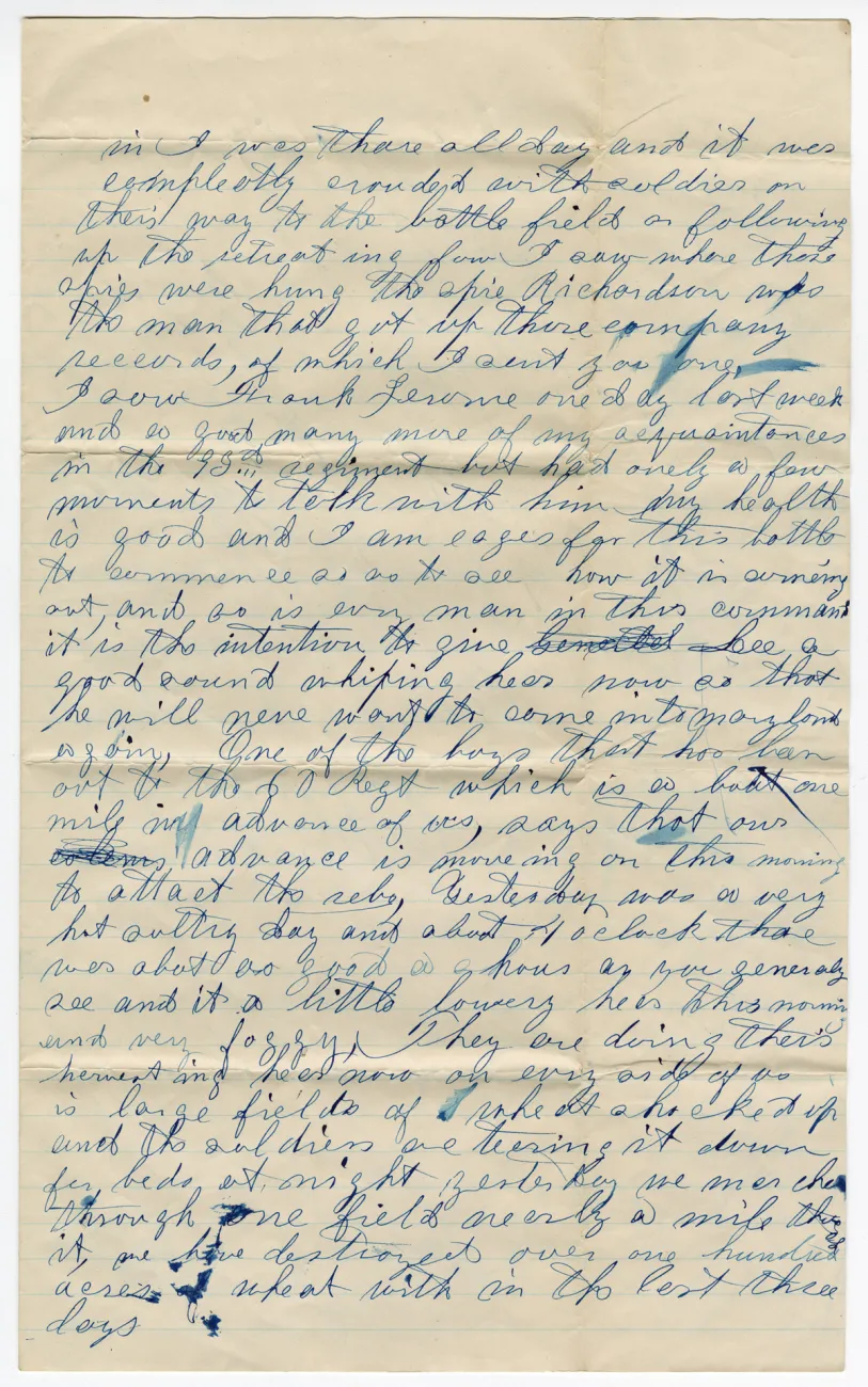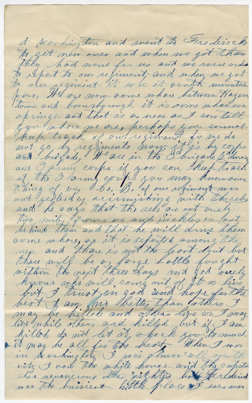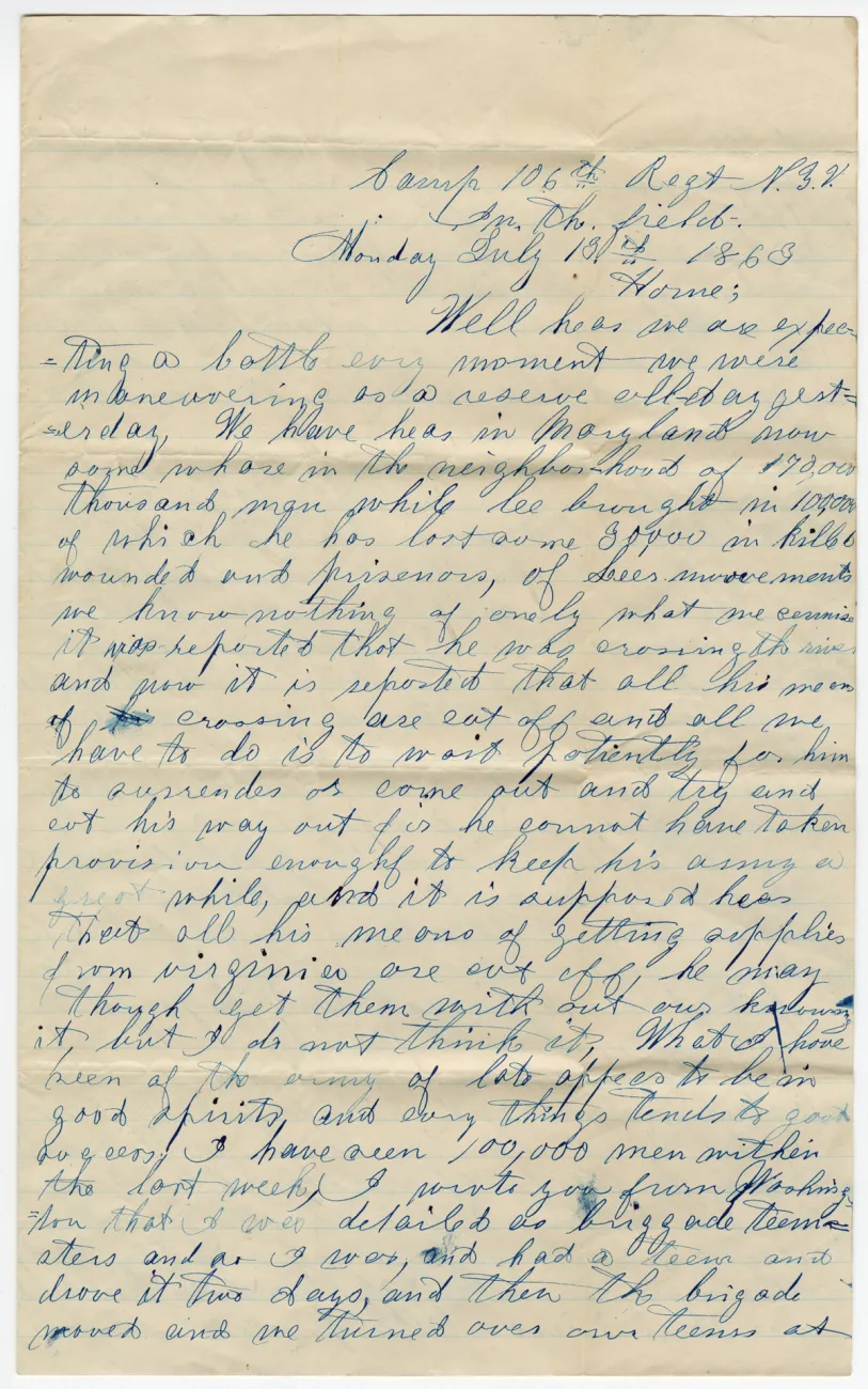 Overview Creator: Sunderland, Darwin Subject: Sunderland, Darwin Source:Original letter: ink on paper, 4 p. Language:eng Rights Rights Management:Original materials may be protected by the Copyright Law of the United States (more information). Date Original (Precise) Sun, 07/12/1863 - 19:45 Technical Digitization Specifications:Scanned at 600ppi on Epson 1000XL scanner as 48-bit RGB uncompressed TIFF images. Images resized to 960 pixels wide, 150 dpi, and saved as JPEG (level 10) in Photoshop CS5 with Unsharp Mask of 60:1. Date Digital:Mon, 09/26/2011 - 21:00 Format:image/jpeg Type:Text Location Series:1 Box:1 Folder:25 Excerpt Home, Well hear we are expecting a battle evry moment[.] we were maneuvering as a reserve all day yesterday.