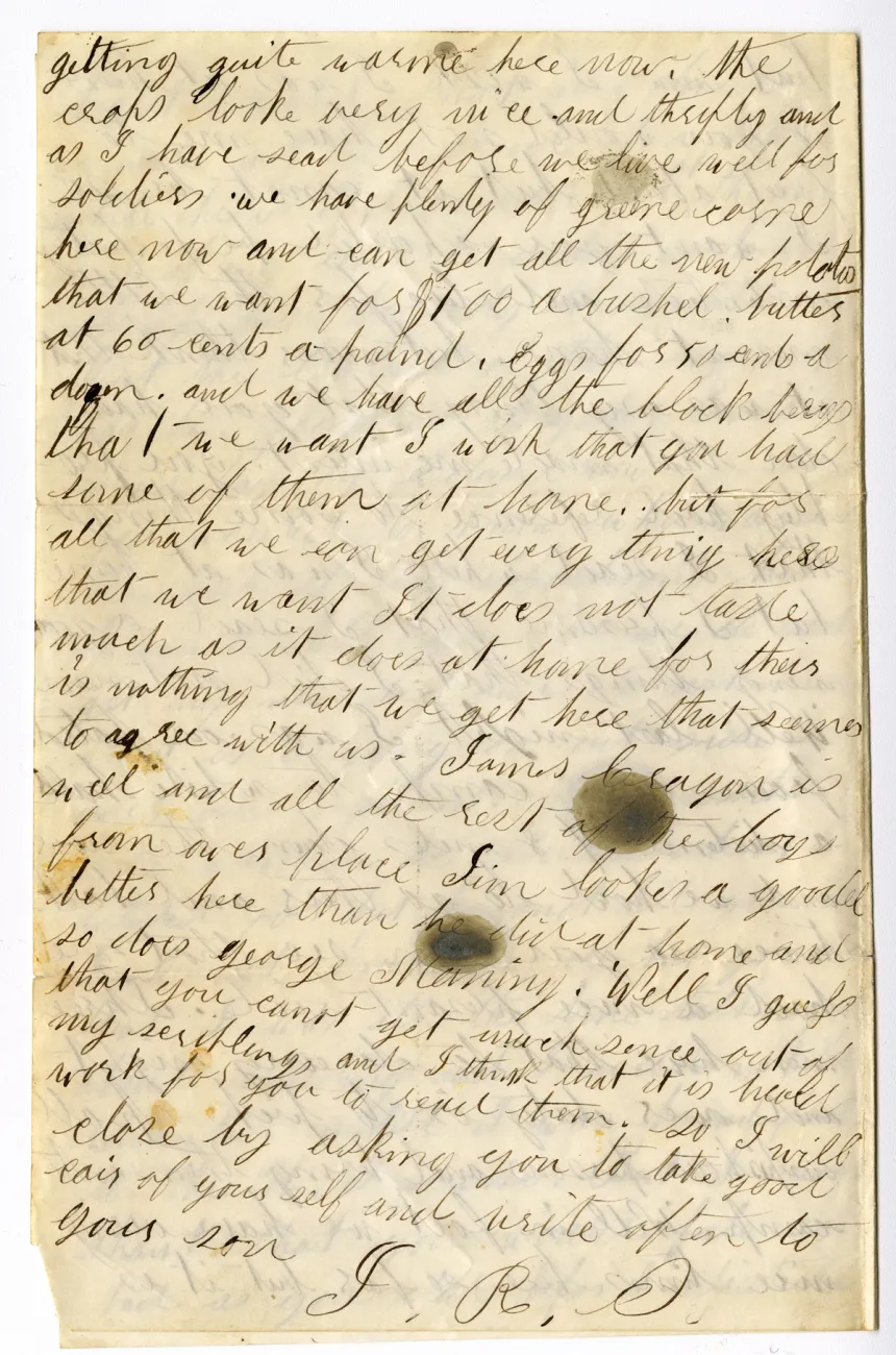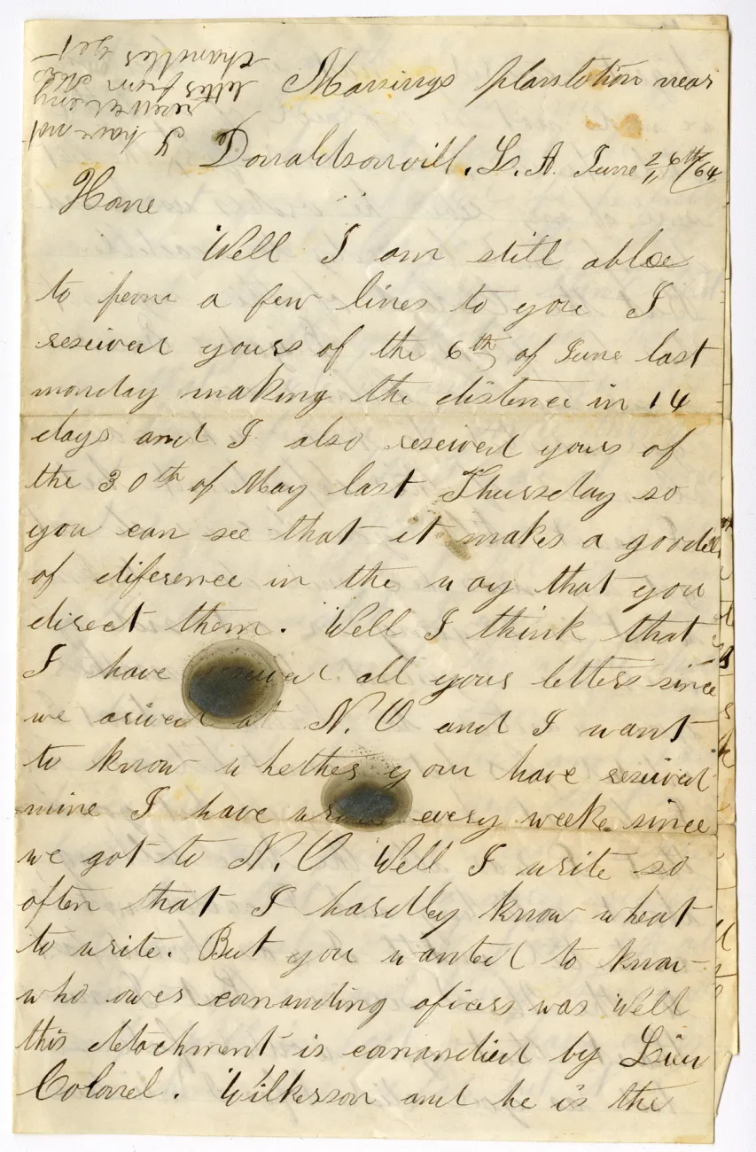 Well I am still able to pen a few lines to you[.] I reseived yours of the 6th of June last Monday making the distence in 14 days and I also reseieved yours of the 30th of May last Thursday so you can see that it makes a goodeal of diference in the way that you direct them.