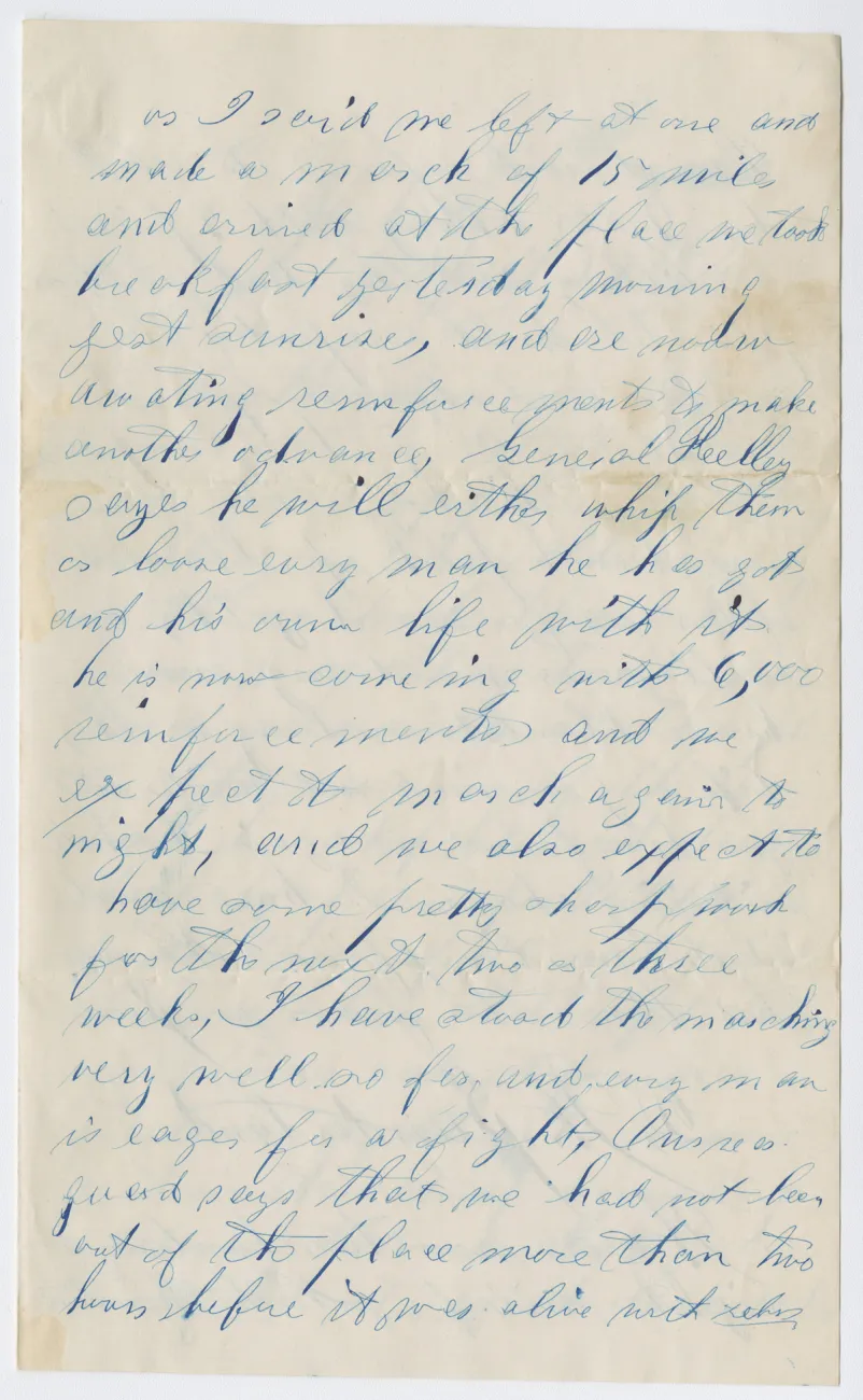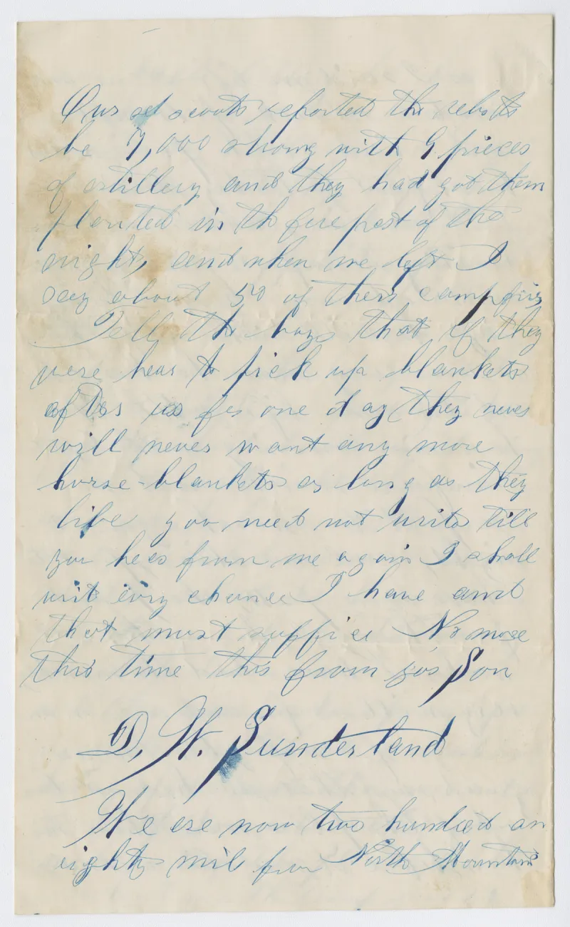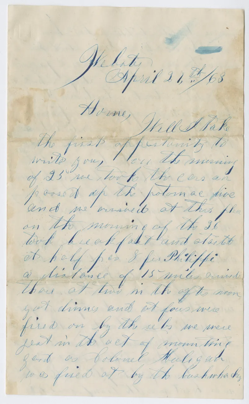 Overview Creator: Sunderland, Darwin Subject: Sunderland, Darwin Coverage:Webster, VA Source:Original letter: ink on paper, 4 p. Language:eng Rights Rights Management:Original materials may be protected by the Copyright Law of the United States (more information). Date Original (Precise) Sun, 04/26/1863 - 19:45 Technical Digitization Specifications:Scanned at 600ppi on Epson 1000XL scanner as 48-bit RGB uncompressed TIFF images. Images resized to 960 pixels wide, 150 dpi, and saved as JPEG (level 10) in Photoshop CS5 with Unsharp Mask of 60:1. Date Digital:Mon, 09/26/2011 - 21:00 Format:image/jpeg Type:Text Location Series:1 Box:1 Folder:18 Excerpt Home, Well I take the first opportunity to write you. On morning of the 25 we took the cars and passed up the Potomac River and we arrived at this place.