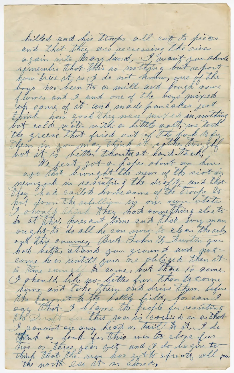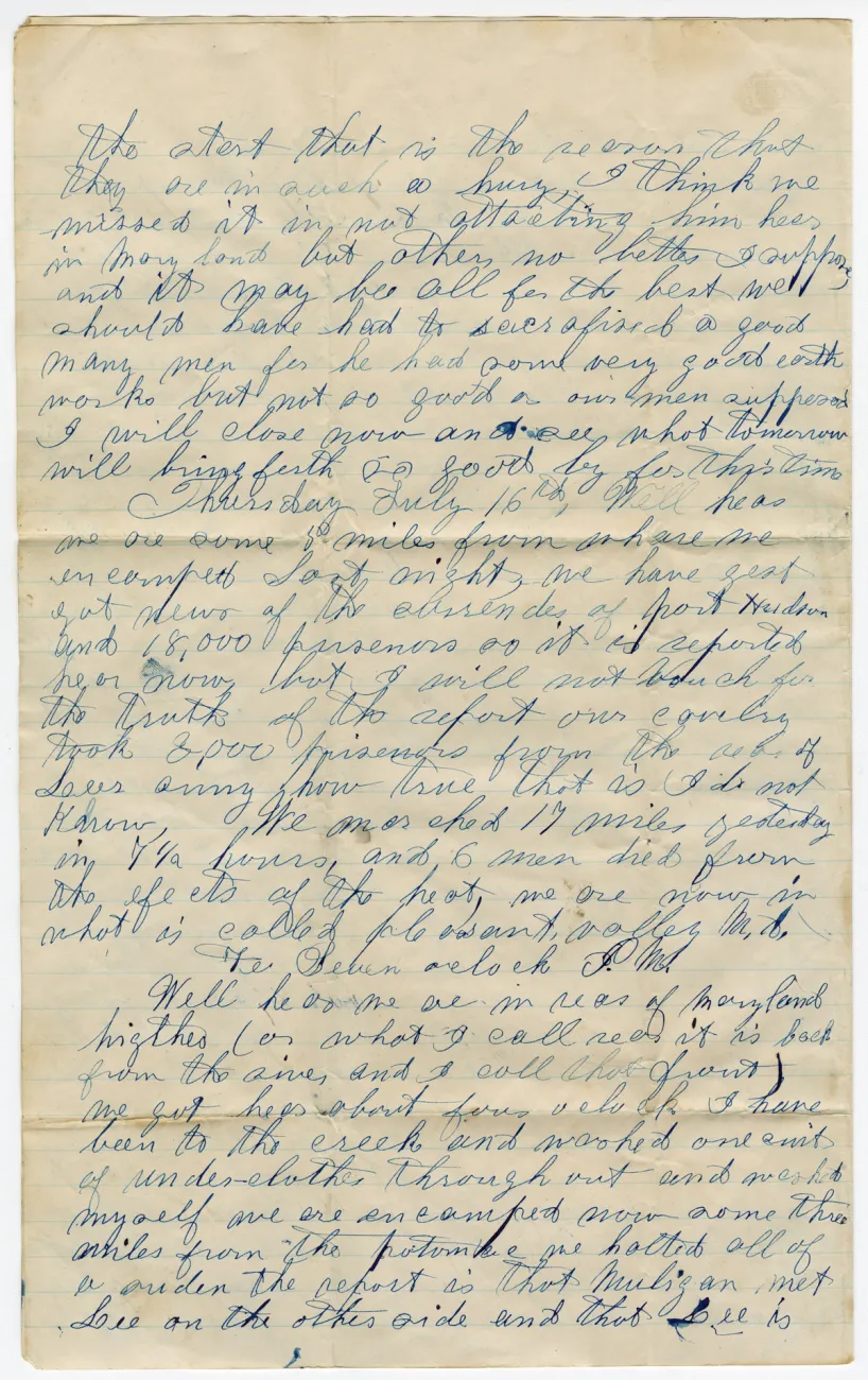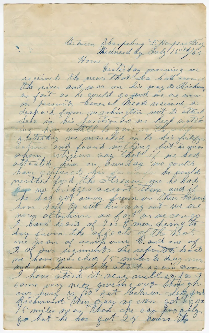 Overview Creator: Sunderland, Darwin Subject: Sunderland, Darwin Coverage:Sharpsburg, MDHarpers Ferry, WV Source:Original letter: ink on paper, 4 p. Language:eng Rights Rights Management:Original materials may be protected by the Copyright Law of the United States (more information). Date Original (Precise) Tue, 07/14/1863 - 19:45 Technical Digitization Specifications:Scanned at 600ppi on Epson 1000XL scanner as 48-bit RGB uncompressed TIFF images. Images resized to 960 pixels wide, 150 dpi, and saved as JPEG (level 10) in Photoshop CS5 with Unsharp Mask of 60:1. Date Digital:Tue, 09/27/2011 - 21:00 Format:image/jpeg Type:Text Location Series:1 Box:1 Folder:26 Excerpt Home Yesterday morning we received the news that Lee had crossed the river and was on his way to Richmond as fast as he could go and we are now in persuit.