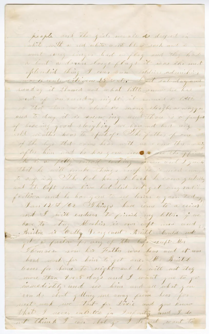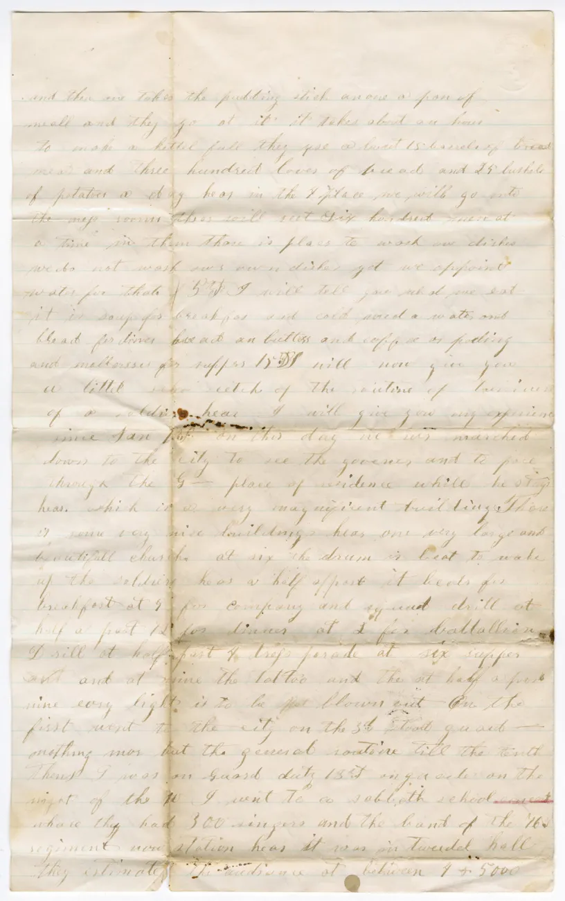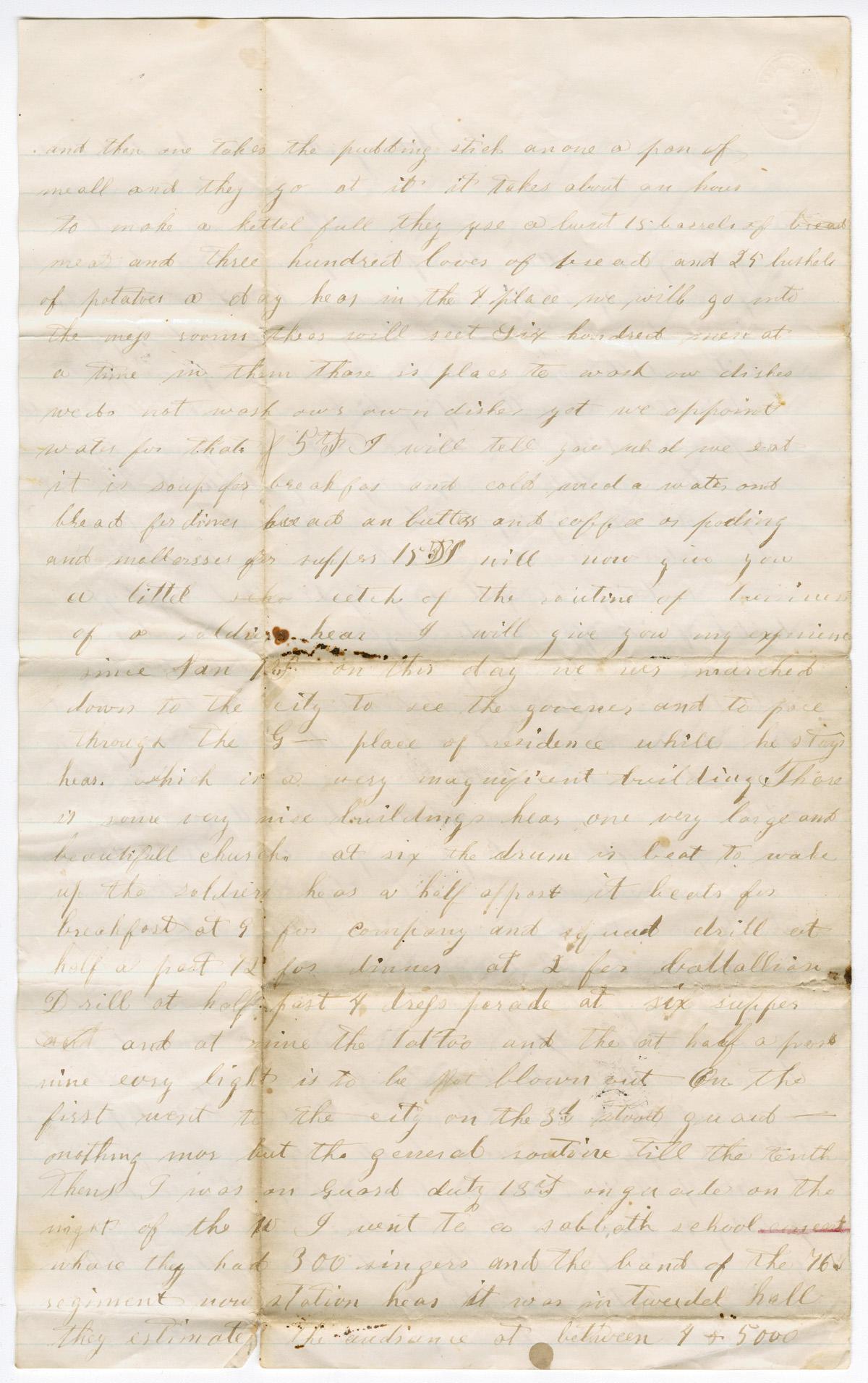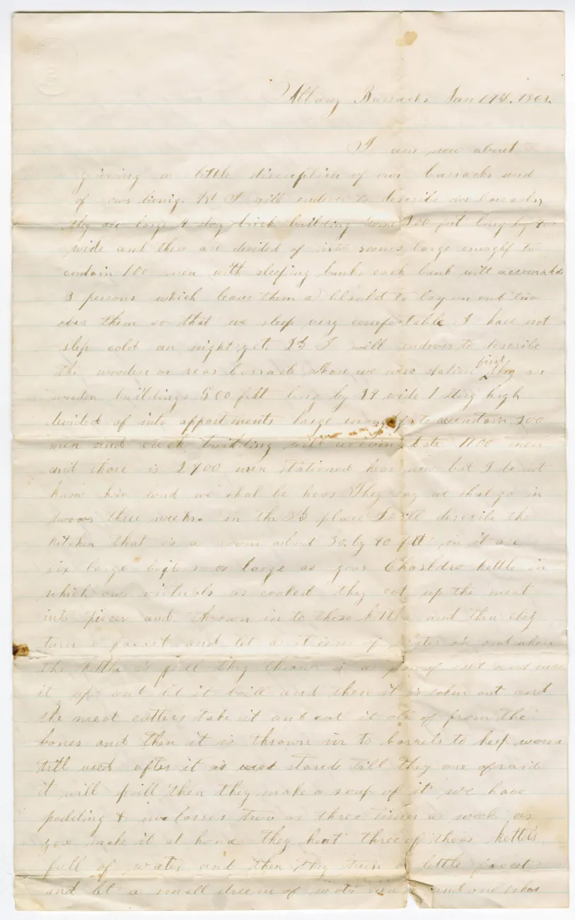 giving a little description of our barracks and of our living. 1st I will endeavor to describe our barracks. They are large 4 story brick building some 200 feet long by 40 wide and these are divided of into room large enough to contain 100 men with sleeping bunks.
