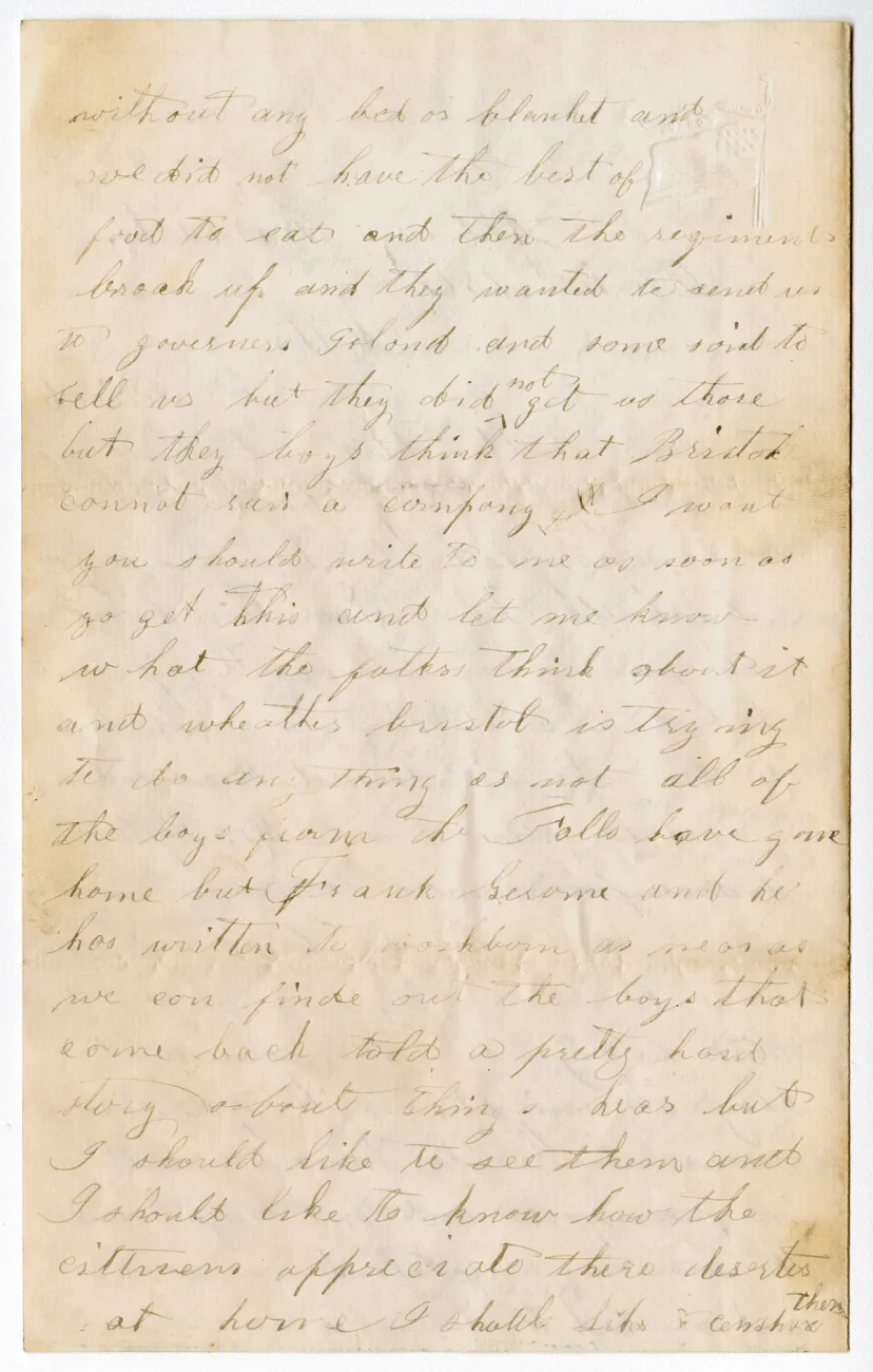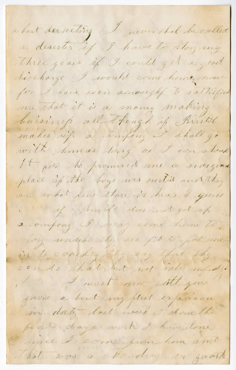 Mother, I received Your Letter this Fore-noon and you may be sure that I was glad to hear from you. I should have been home be fore you had written if Bristol had done as he said he would but he has not so I do not know when I shall be home now