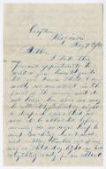 May 3, 1863 | Grafton, VA | Mother, I take this present opportunity to write a few lines to you to let you know that I am well. We are still in the front of the enemy and do not know how soon we may be attacked.… |