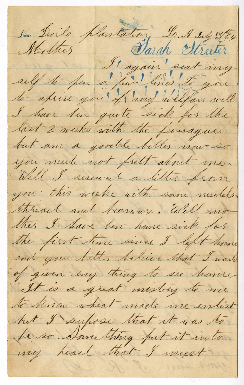 I again seat myself to pen a few lines to you to apprise you of my welfair[.] well I have ben quite sick for the last 2 weeks with the feveragure [fever ague] but am a goodele [good deal] better now so you neede not fret about me.