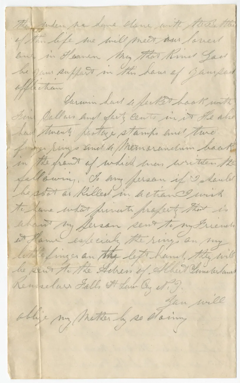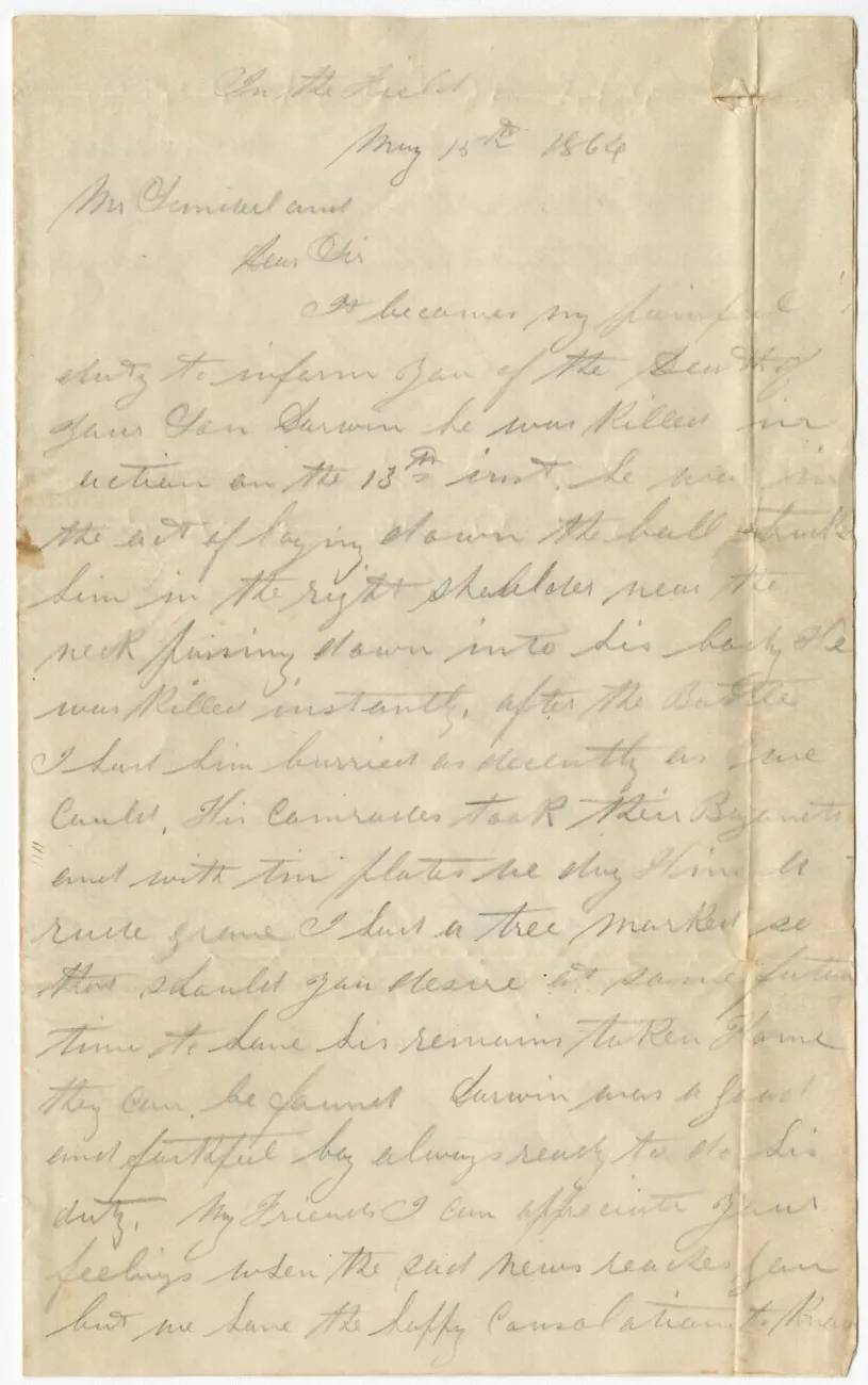 It becomes my faithful duty to inform you of the death of your son Darwin[.] he was killed in action on the 13th inst. he was in the act of laying down[.] the ball struck him in the right shoulder near the neck passing down into his body.
