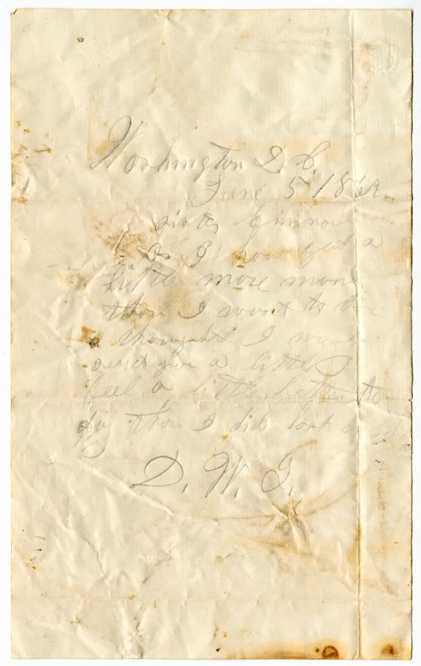 Overview Creator: Sunderland, Darwin Subject: Sunderland, Darwin Coverage:Washington, DC Source:Original letter: pencil on paper, 1 p. w/ envelope Language:eng Rights Rights Management:Original materials may be protected by the Copyright Law of the United States (more information). Date Original (Precise) Thu, 06/04/1863 - 19:45 Technical Digitization Specifications:Scanned at 600ppi on Epson 1000XL scanner as 48-bit RGB uncompressed TIFF images. Images resized to 960 pixels wide, 150 dpi, and saved as JPEG (level 10) in Photoshop CS5 with Unsharp Mask of 60:1. Date Digital:Mon, 09/26/2011 - 21:00 Format:image/jpeg Type:Text Location Series:1 Box:1 Folder:20 Excerpt sister Emma As I have got a little more money than I want to use I thought I would send you a little[.]