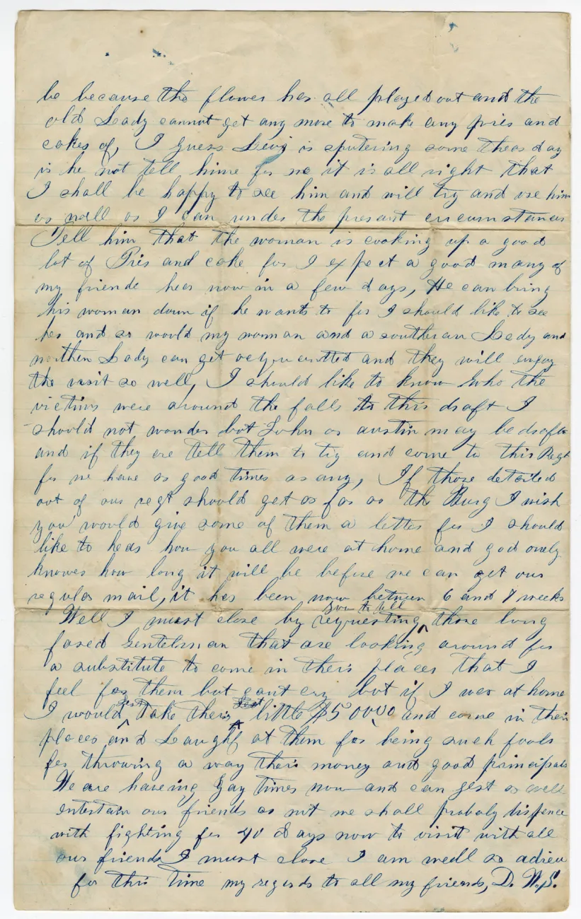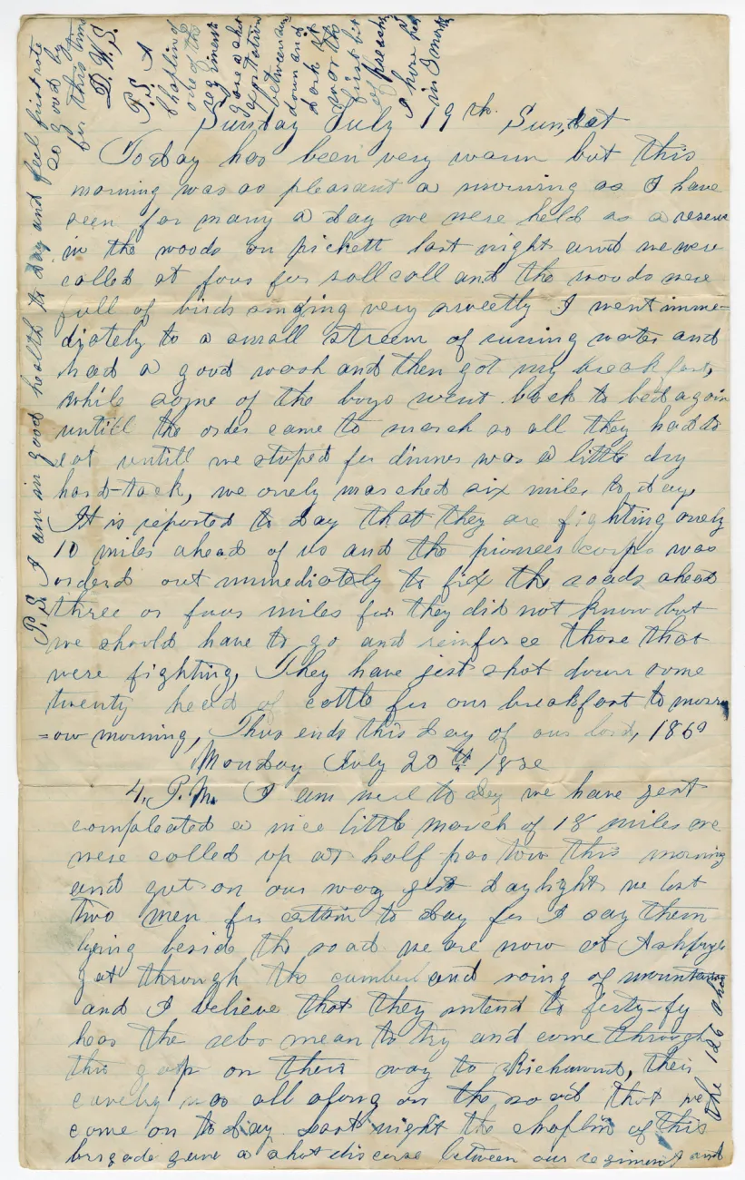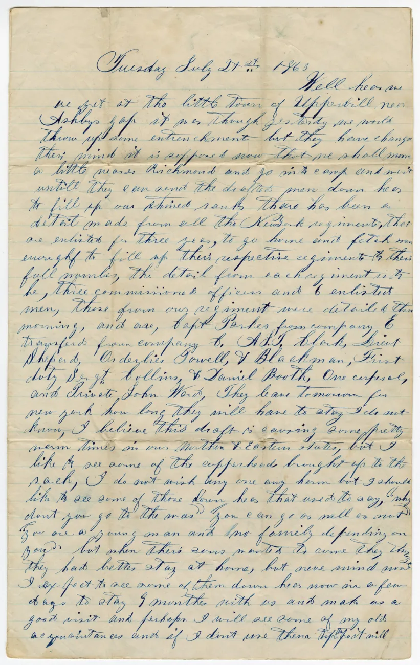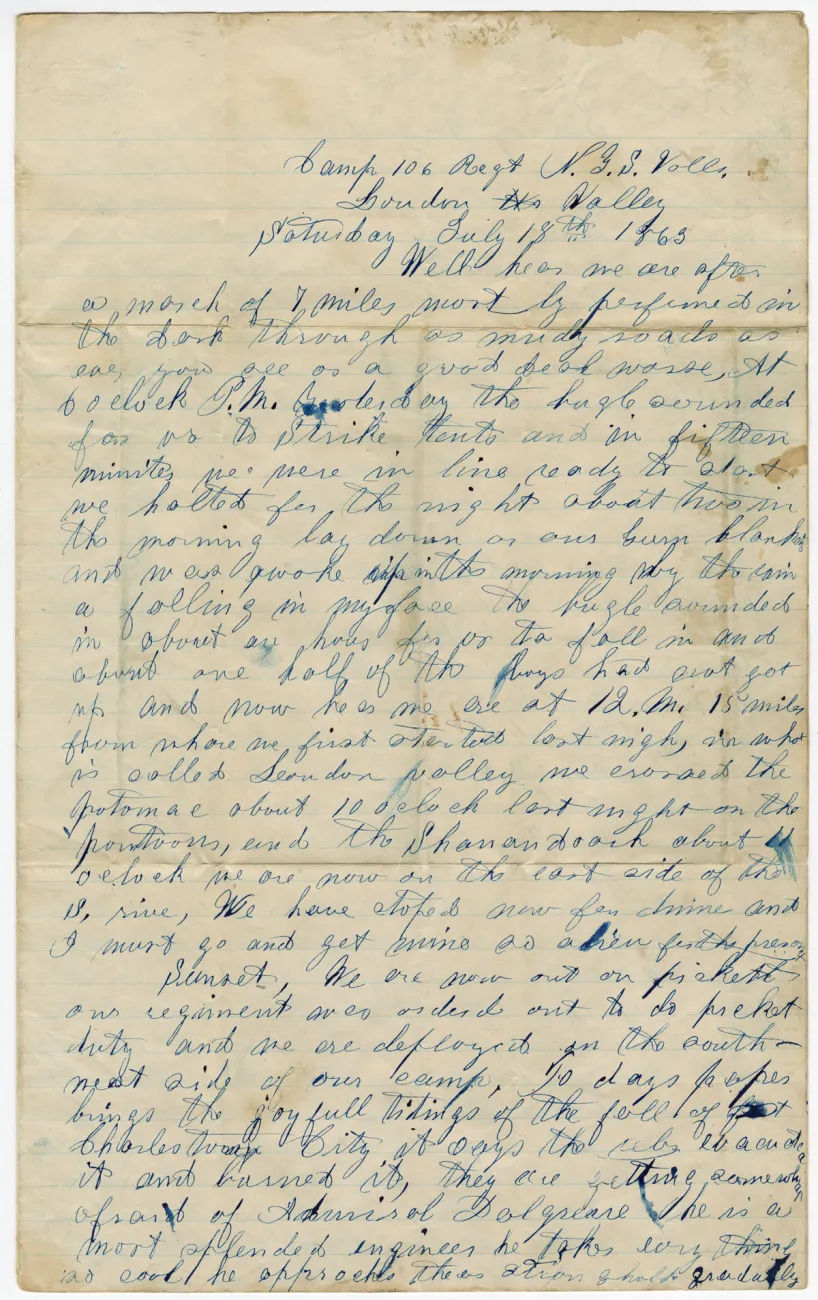 Well hear we are after a march of 7 miles mostly performed in the dark through as mudy roads as ever you see as a good deal worse. At 6 o clock P.M. yesterday the bugle sounded for us to Strike tents and in fifteen minutes we were in line ready to start[.]