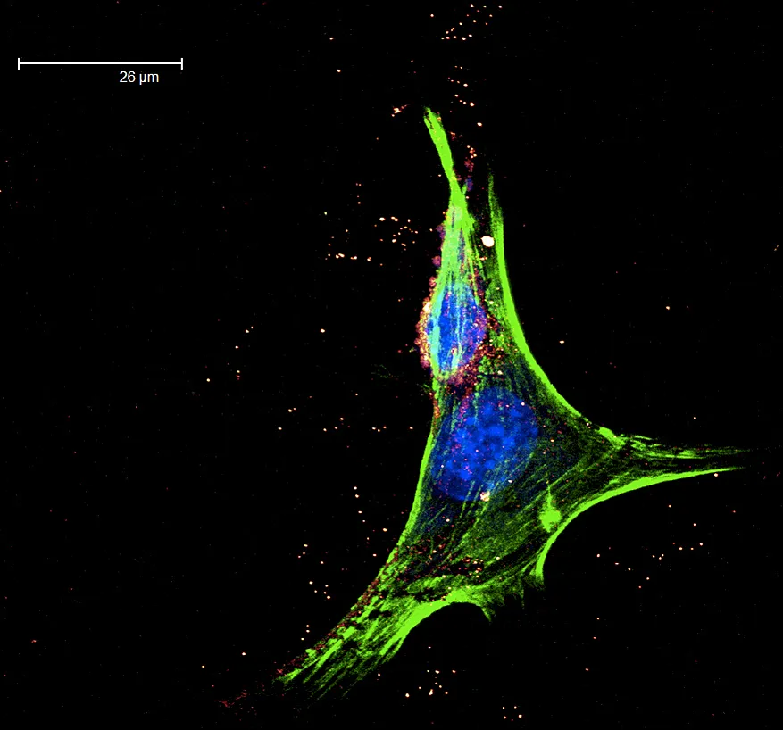 Max Image. Depth of section: 8.93 µm. Nuclei in blue, microtubule associated proteins (MAPs) in glow, and f-actin filaments in green